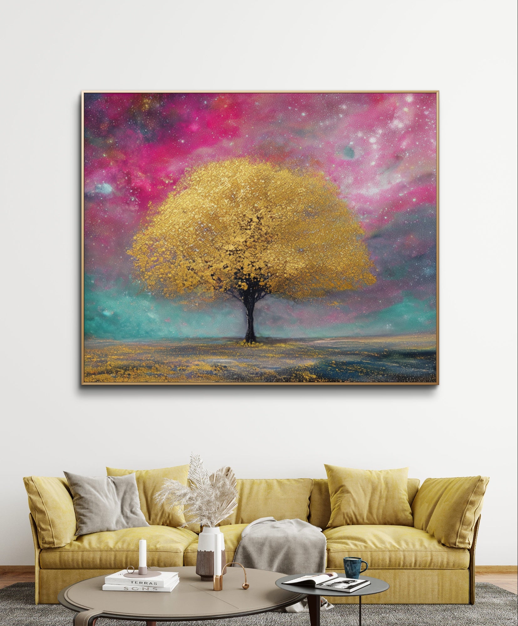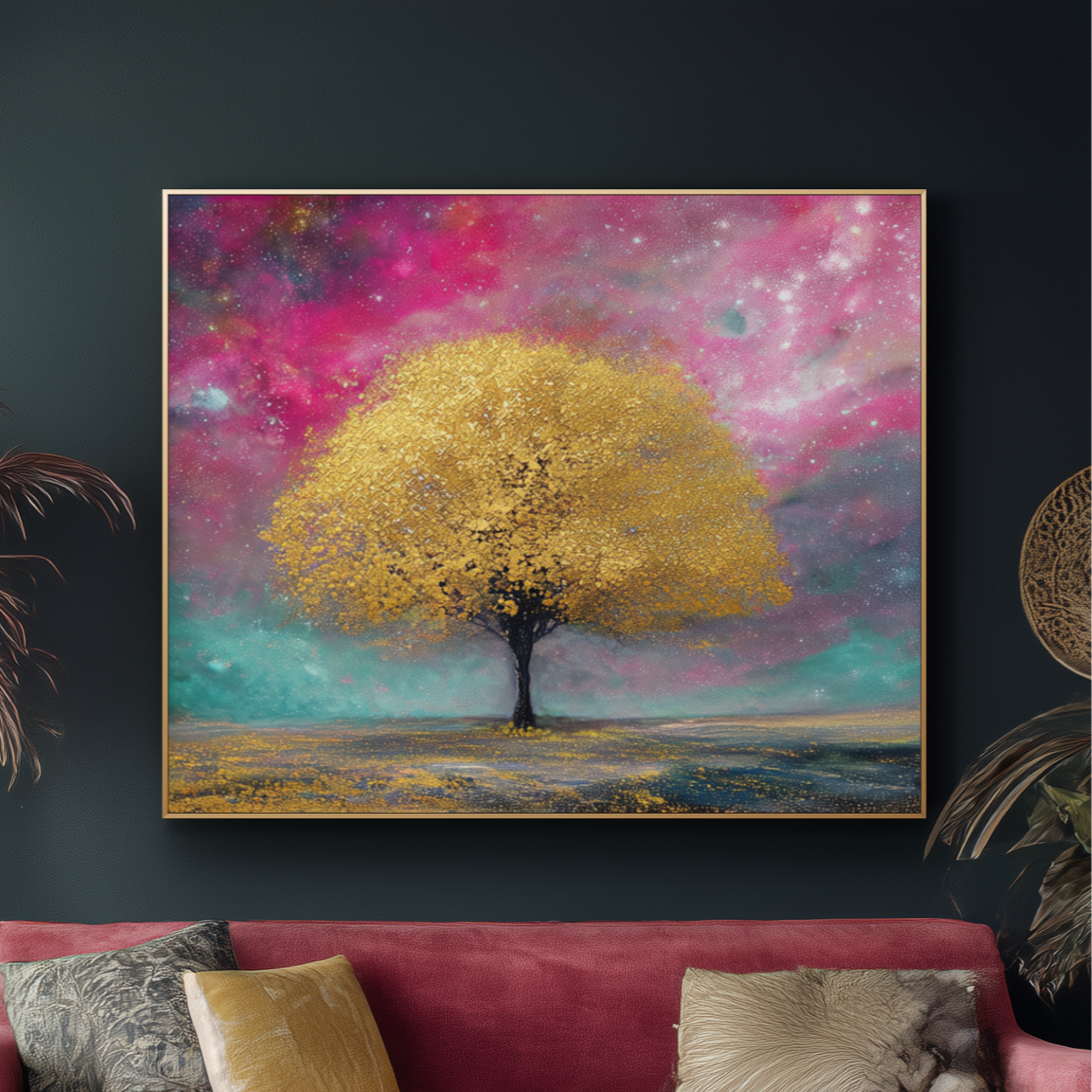 In schimmerndes Gold getaucht und unter einem Himmel voller kosmischer Farben steht Auroras Baum als Symbol für Schönheit, Hoffnung und zeitloses Wunder. Sein strahlendes Blätterdach und die himmlische Kulisse laden den Betrachter in ein traumhaftes Reich ein, in dem Natur und Universum in harmonischer Pracht aufeinandertreffen.