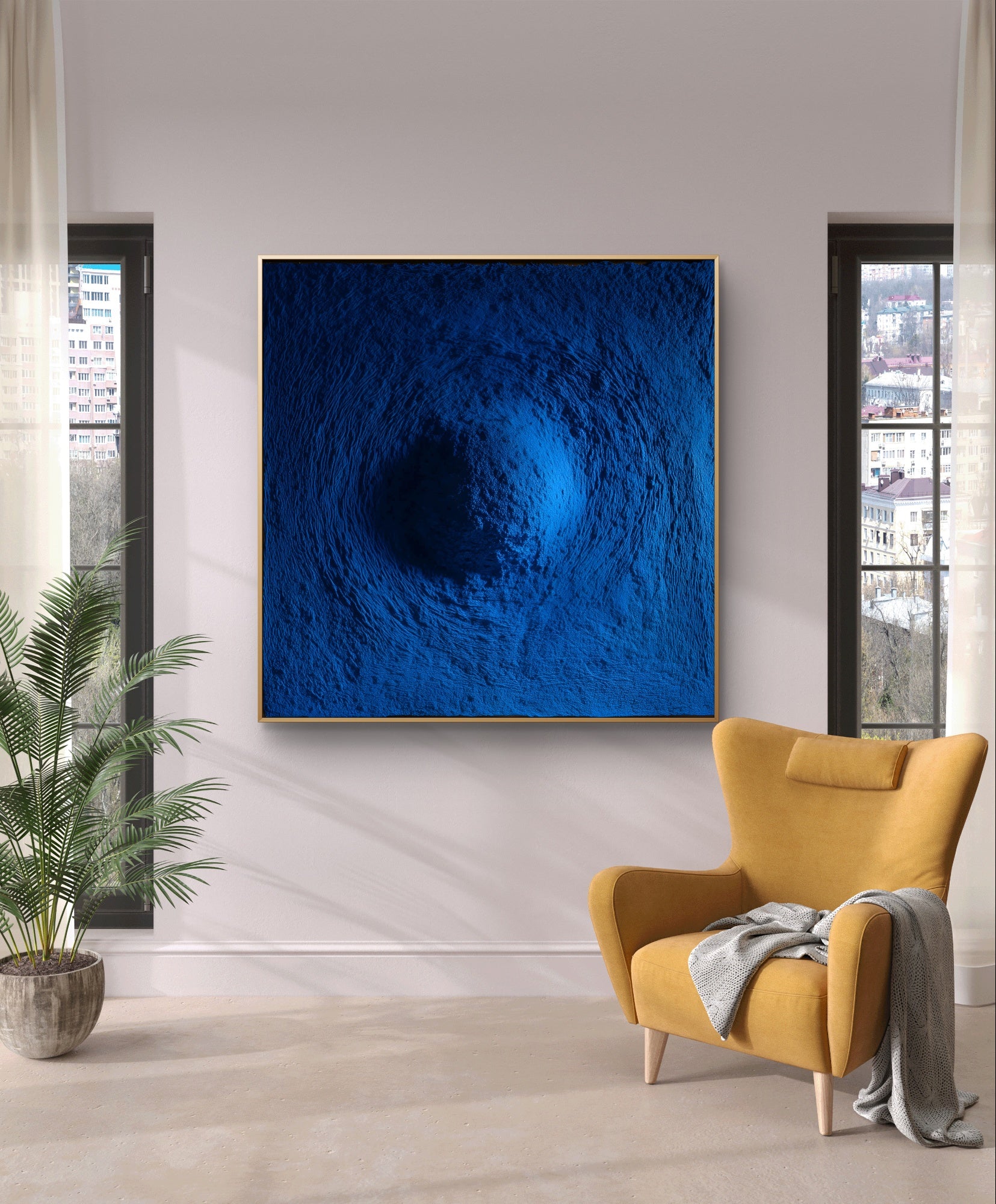 „Blue Abyss“ entführt den Betrachter in eine Welt unendlicher Tiefe und stiller Intensität. Seine strukturierte Oberfläche vermittelt das Gefühl, vor einer riesigen kosmischen Leere zu stehen, einem Ort, an dem Stille Kraft birgt und die Fantasie grenzenlos dehnbar ist. Dieses Werk verwandelt jeden Raum in einen Ort der Besinnung und Erhabenheit.