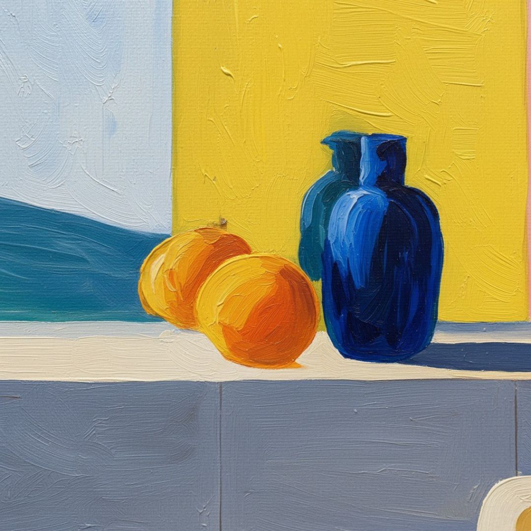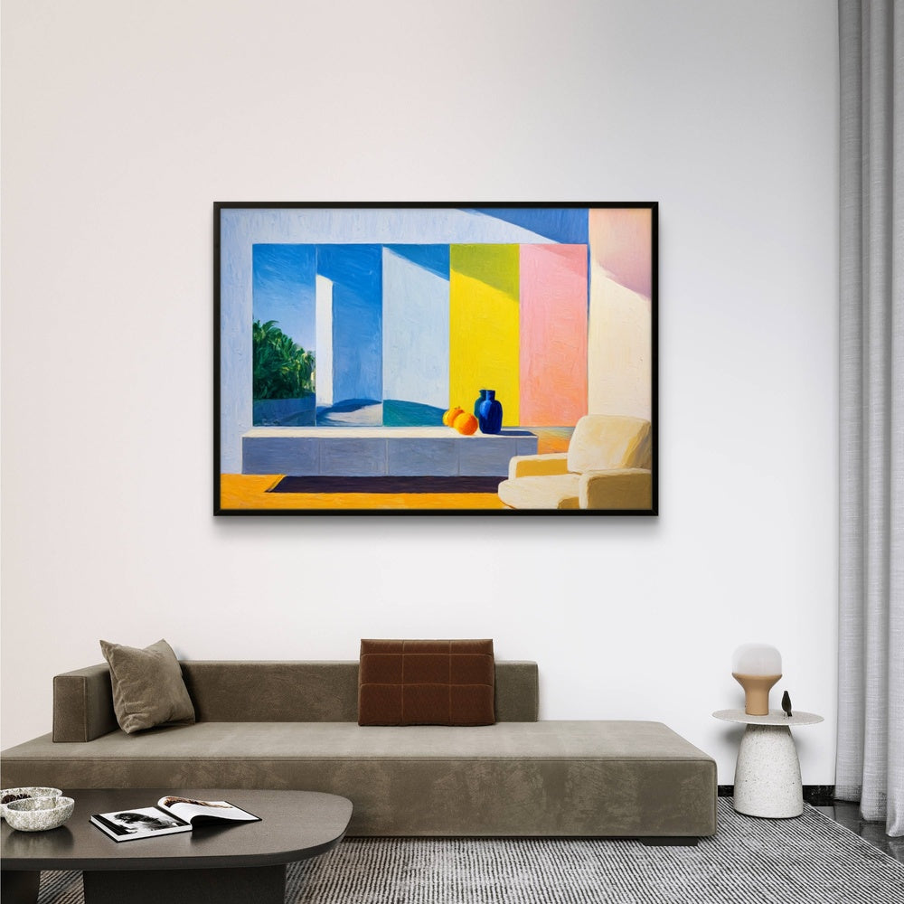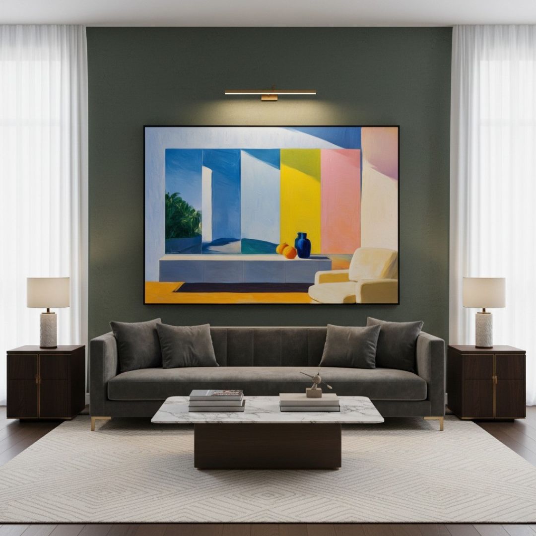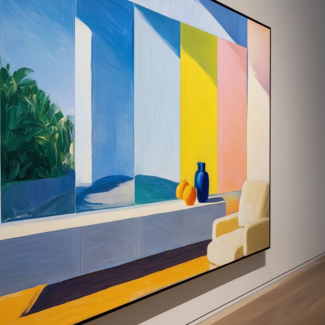 Dieses Gemälde ist ein Dialog zwischen Architektur und Emotion und verwandelt Wände in lebendige Lichtfelder. Kräftige Farb- und Schattenflächen kreuzen sich und schaffen einen Raum, der sich zugleich greifbar und traumhaft anfühlt – eine Erinnerung daran, wie die Wahrnehmung selbst die Welt konstruiert, in der wir leben.