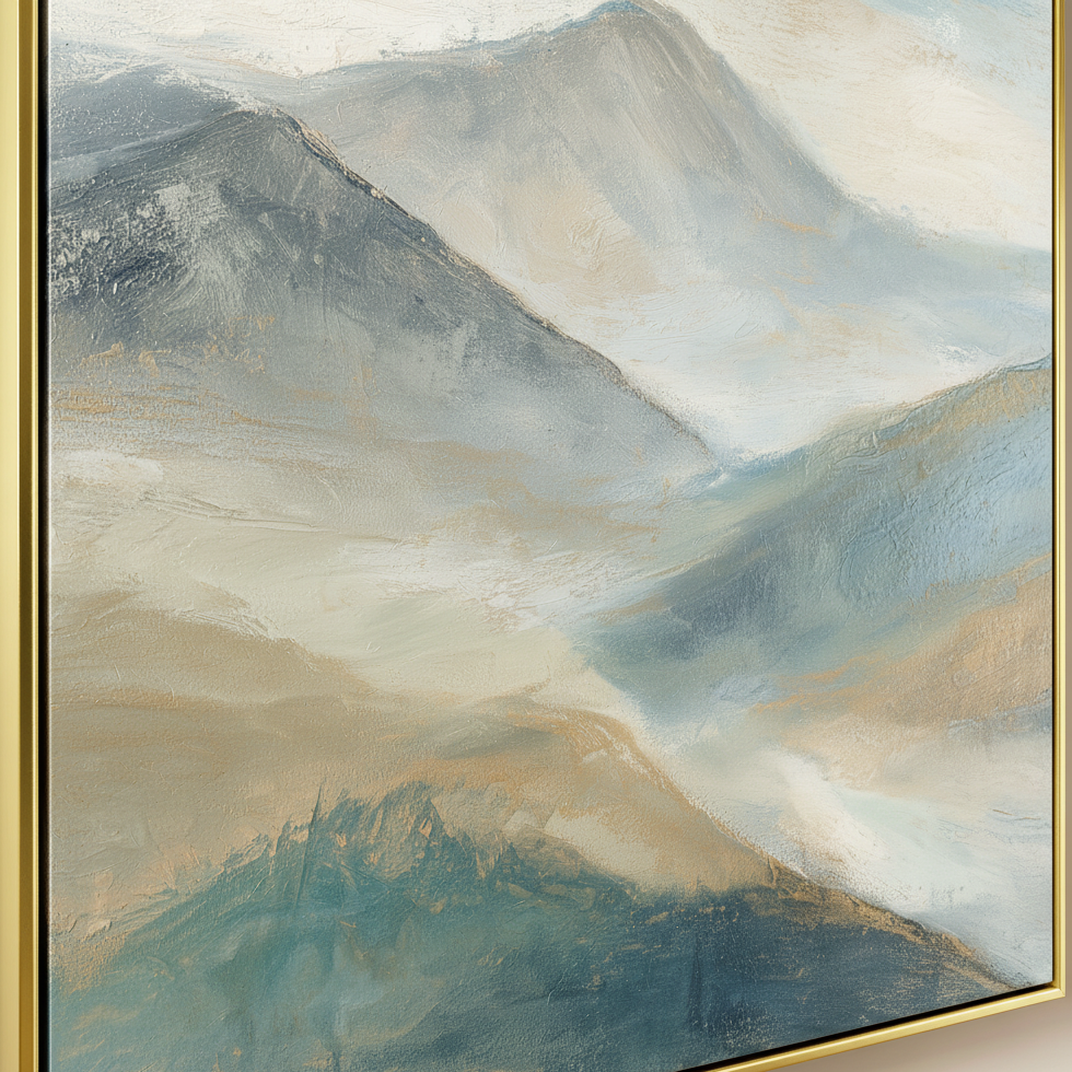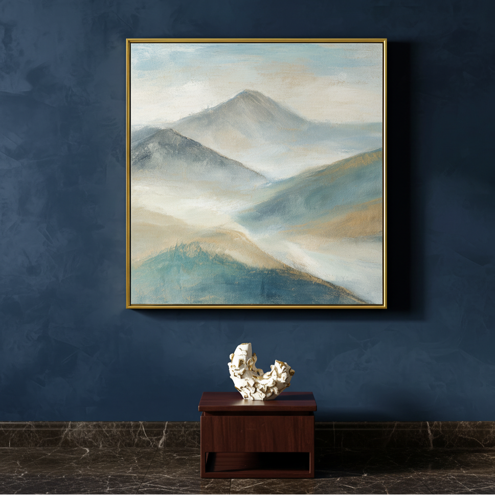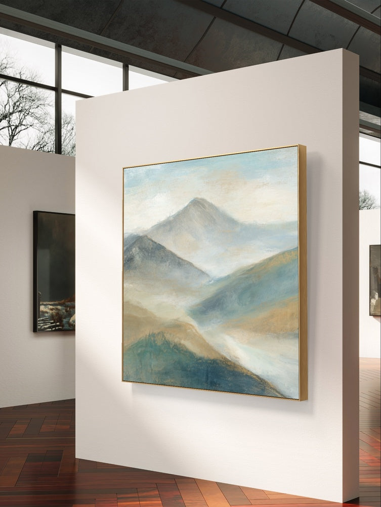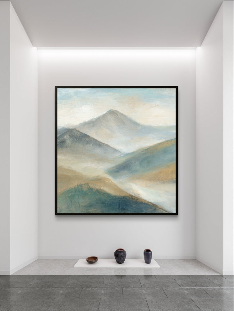 „Drifting into Peace“ lädt Sie ein, in eine ruhige Traumlandschaft einzutauchen, in der sanfte Hügel und neblige Horizonte den Lärm der Welt verschwimmen lassen. Sanfte Blau-, Beige- und Grüntöne verschmelzen wie das Flüstern des Windes über fernen Bergen und erzeugen ein Gefühl der Stille. Handgemalt mit zarter Textur und Tiefe wird dieses Werk zu einem visuellen Rückzugsort, perfekt für Räume, in denen Ruhe nicht nur erwünscht, sondern unerlässlich ist.