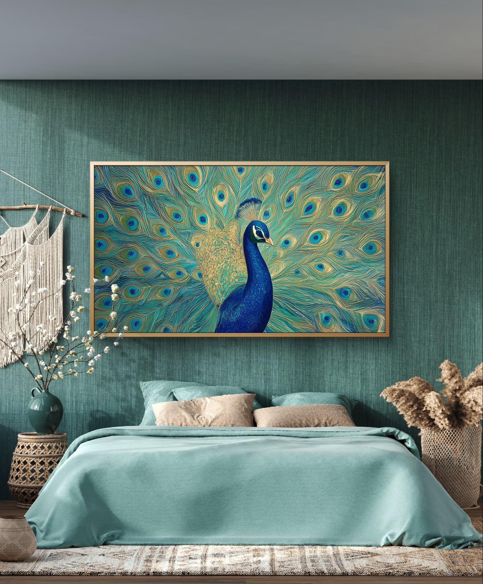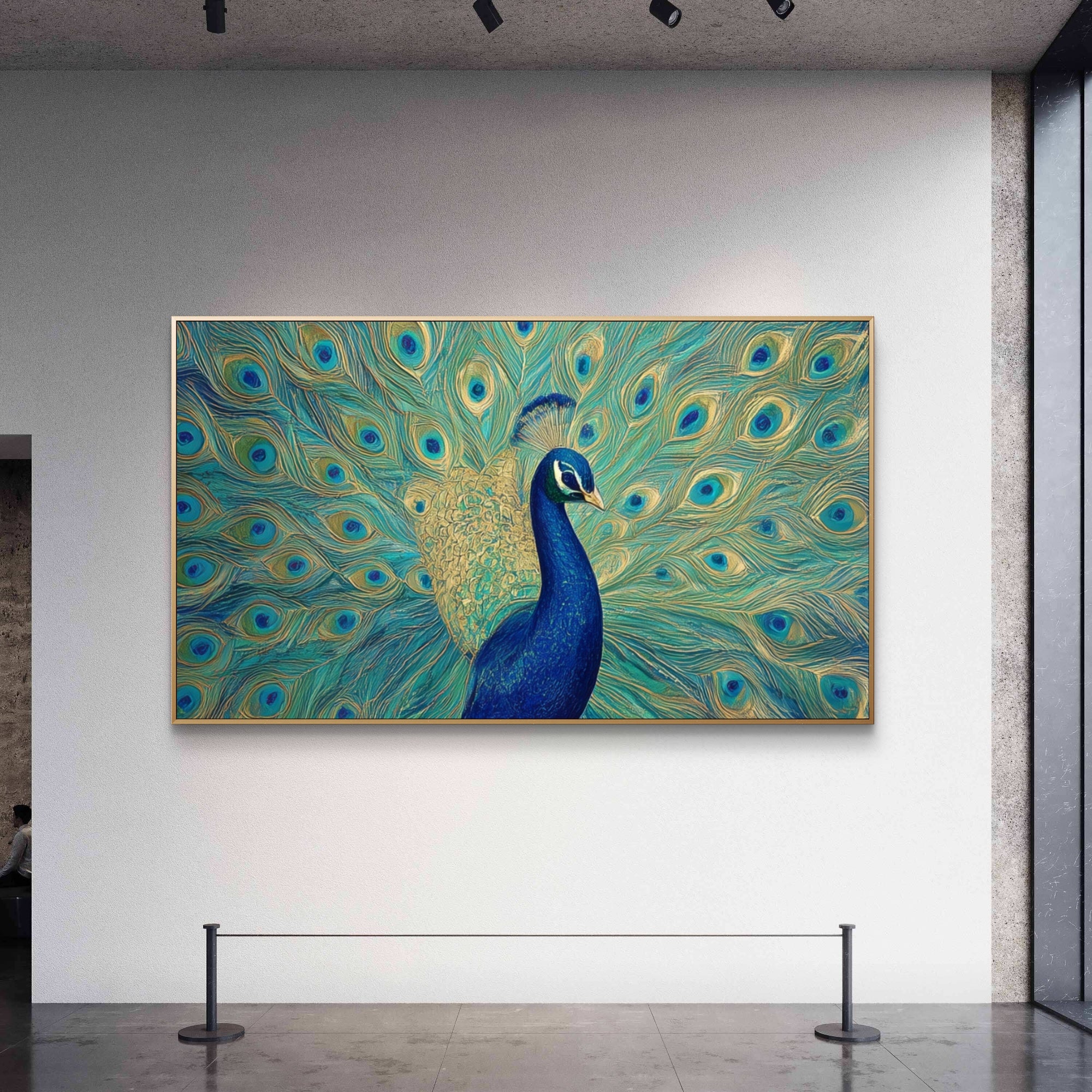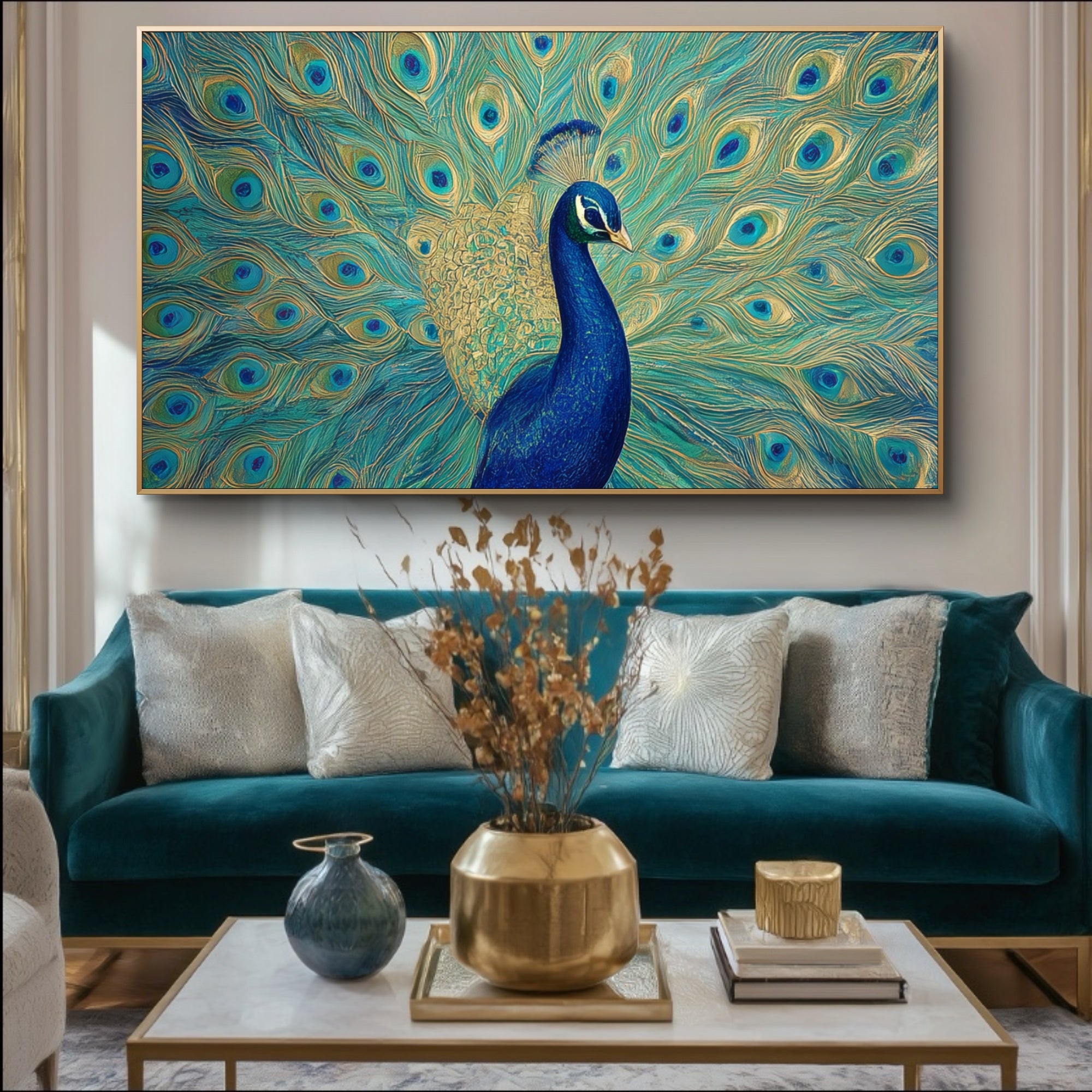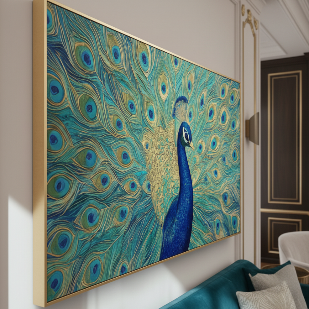 „Feathers of Fortune“ strahlt Eleganz und Selbstbewusstsein aus und fängt die majestätische Präsenz eines Pfaus in voller Pracht ein. Jede schimmernde Feder, gemalt in leuchtenden Blau-, Gold- und Grüntönen, symbolisiert Schönheit, Stolz und Wohlstand. Dieses Statement-Stück verleiht jedem Interieur ein Gefühl von Majestät und Anmut und zelebriert die Kunst der Natur in ihrer opulentesten Form.