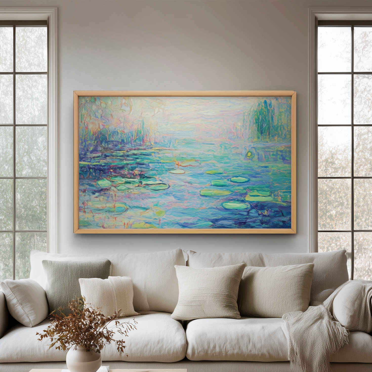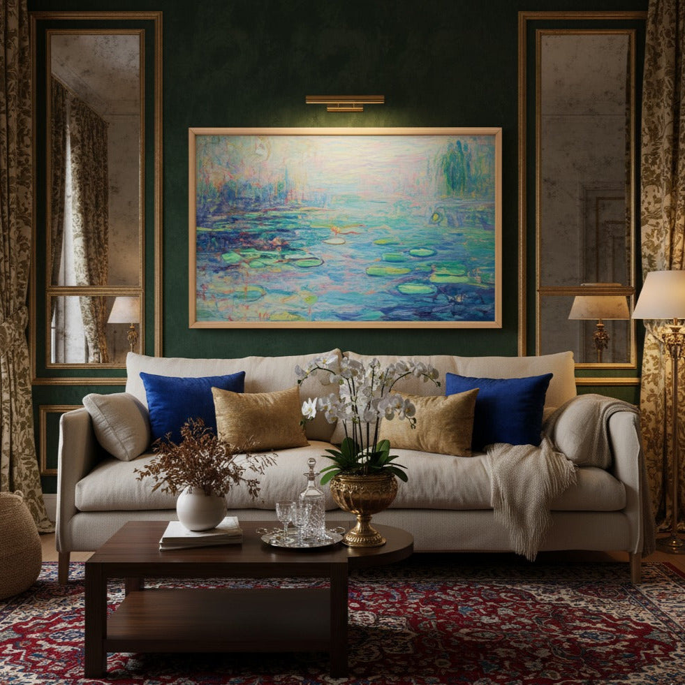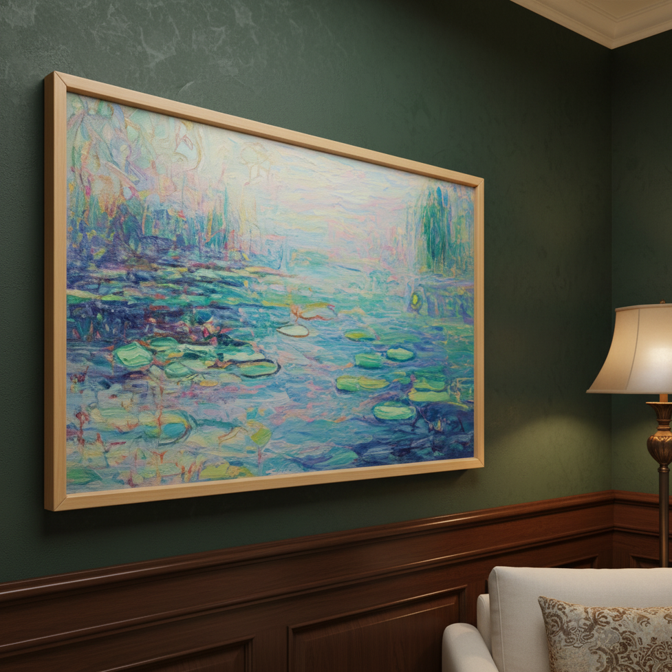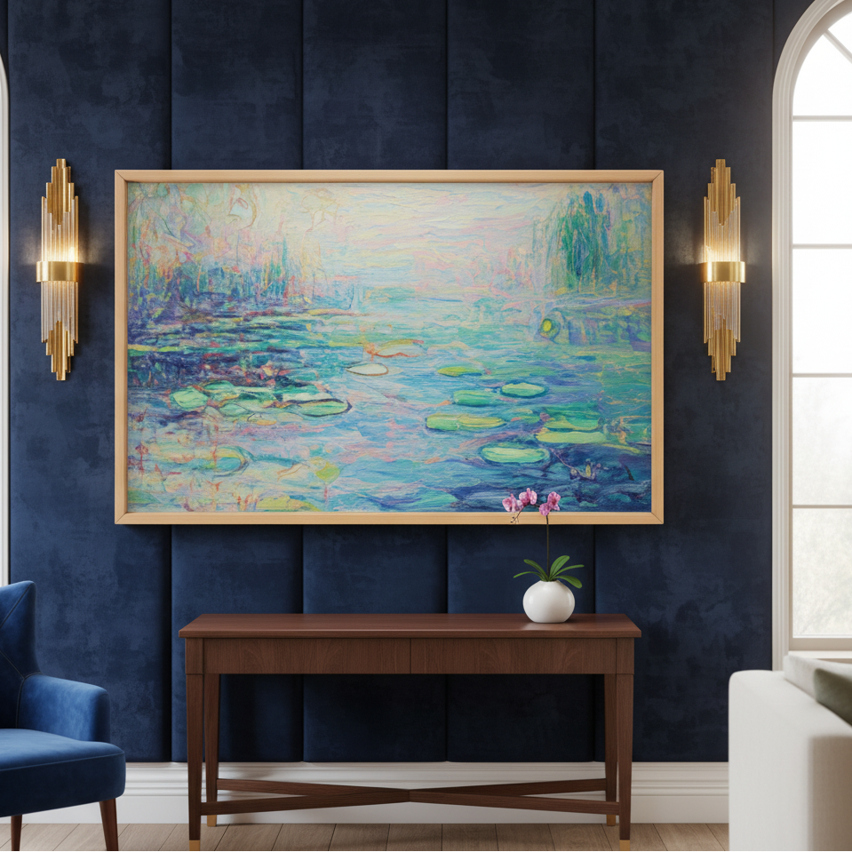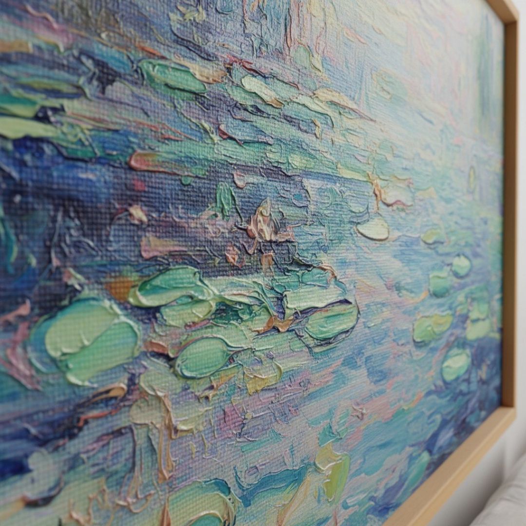 Garden of Reflections fängt einen zeitlosen Tanz aus Licht und Wasser ein. Sanfte Lilien schweben über eine schimmernde Oberfläche, auf der jede Welle einen traumhaften Himmel widerspiegelt. Dieses Kunstwerk strahlt Ruhe aus und bringt ein poetisches Gefühl der Ausgeglichenheit in jeden Wohnraum – eine stille Erinnerung an die Ruhe, die in den stillen Gewässern der Natur zu finden ist.