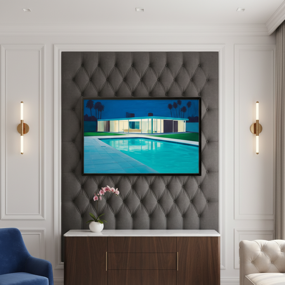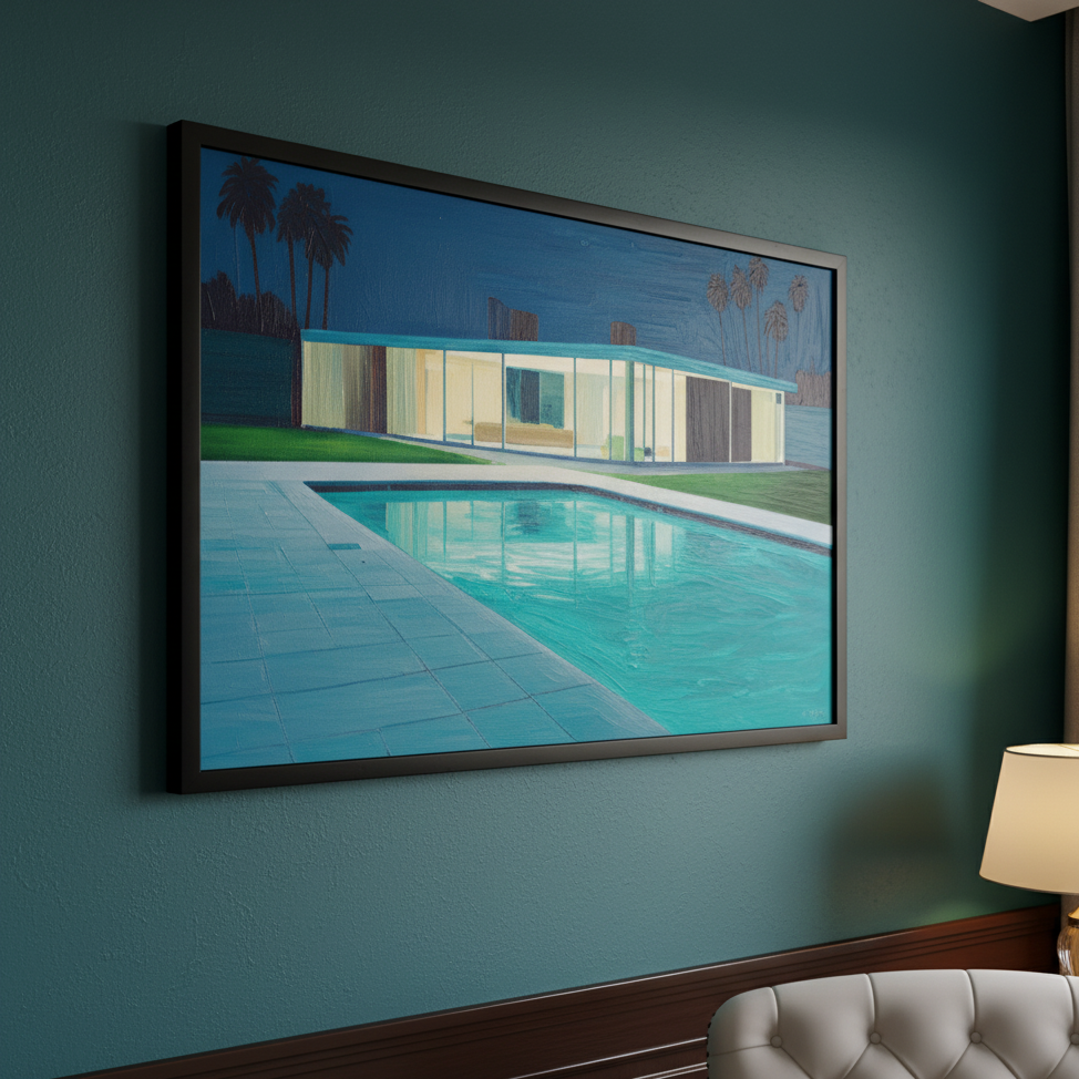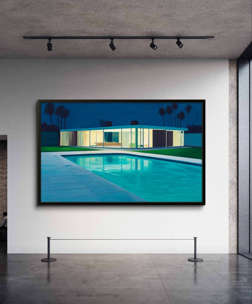 „Glass House Dreams“ fängt die stille Poesie des modernen Lebens ein. Das beleuchtete Haus strahlt Wärme vor dem kühlen Nachthimmel aus, sein Spiegelbild spiegelt sich im stillen Wasser. Es spricht von Einsamkeit, architektonischer Schönheit und der Eleganz der Einfachheit.