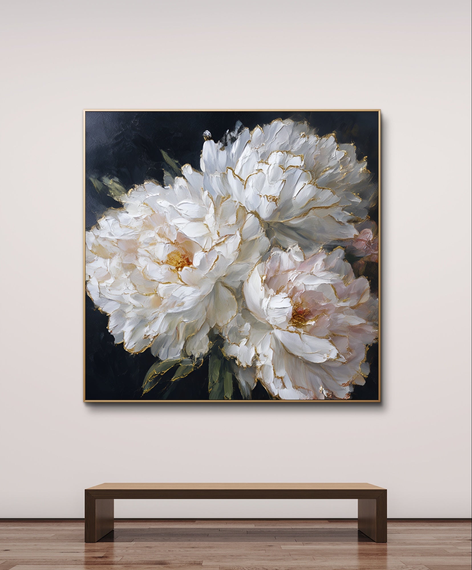 „Golden Edge Blooms“ fängt die stille Majestät voll erblühter Pfingstrosen ein, deren cremeweiße Blütenblätter in zarten Rötönen erstrahlen und von schimmerndem Gold umrandet sind. Jeder Pinselstrich strahlt Eleganz aus und vermittelt ein Gefühl zeitloser Romantik und erlesener Schönheit. Perfekt für Interieurs, die Raffinesse und Anmut ausstrahlen, bringt dieses handgemalte Stück einen Hauch von Luxus und Gelassenheit in Ihr Zuhause.