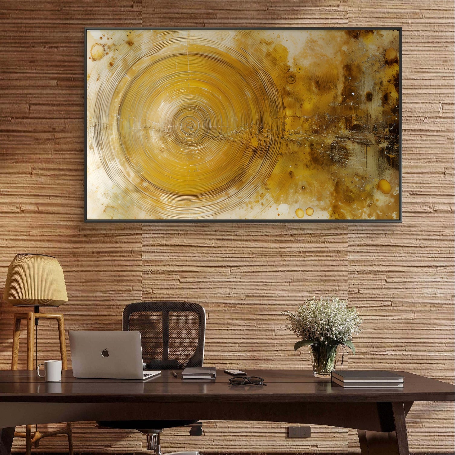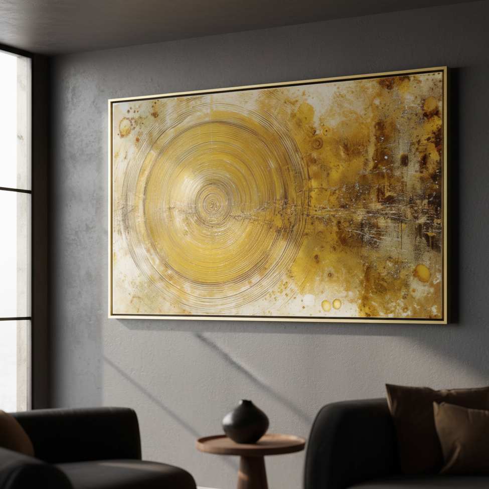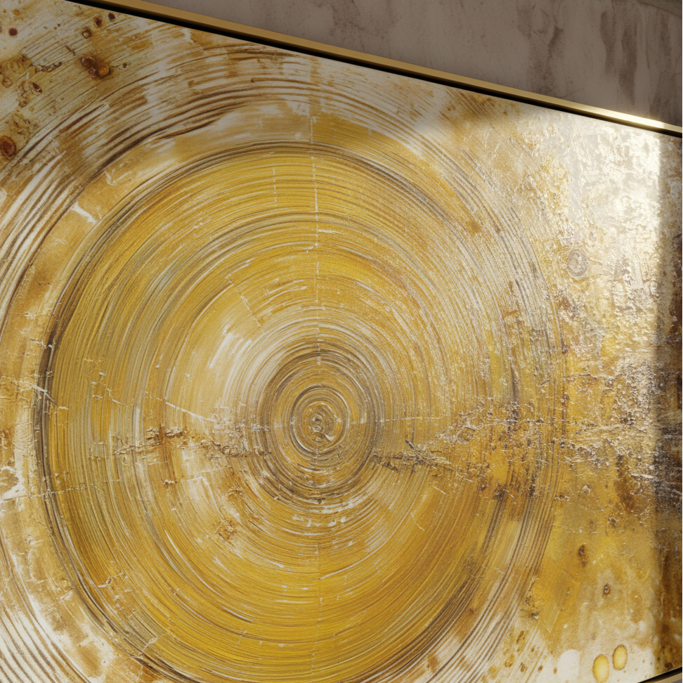 Golden Solstice strahlt die Brillanz der Sonne in ihrem kraftvollsten Moment aus, eingefangen in leuchtenden Goldtönen und strukturierten Kreisbewegungen. Dieses abstrakte Meisterwerk strahlt Wärme, Erneuerung und zeitlose Energie aus und ist ein exquisiter Blickfang für Innenräume, die Licht, Eleganz und Harmonie ausstrahlen.