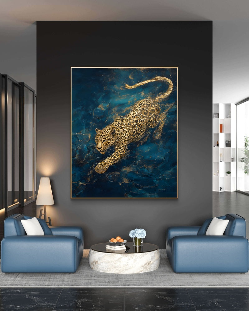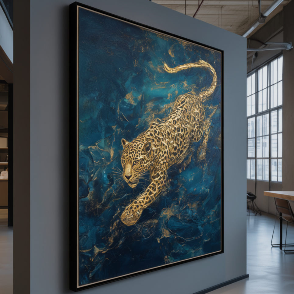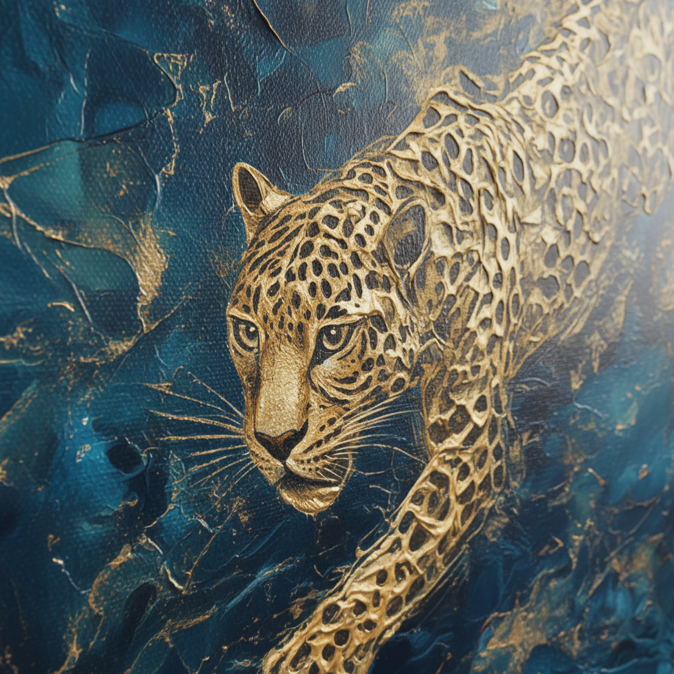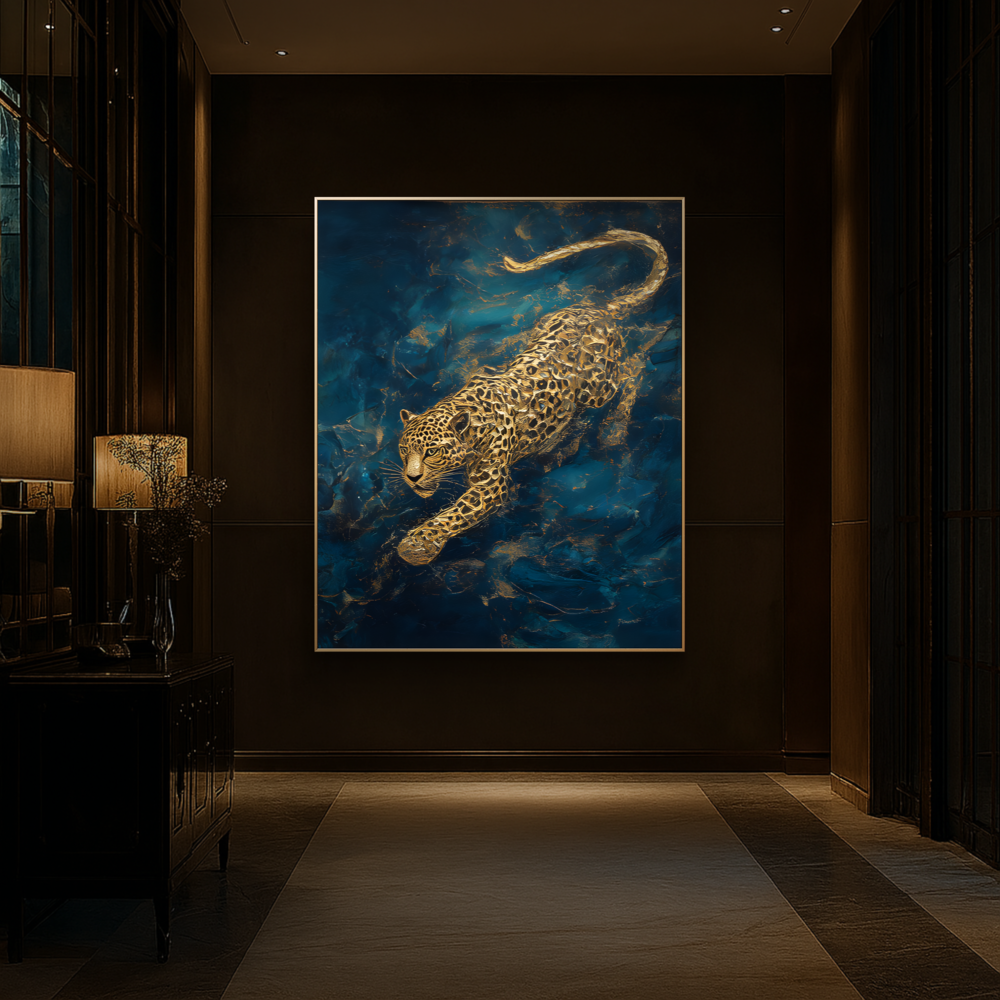 Goldstrike fängt die wilde Eleganz eines Leoparden in Bewegung ein, dessen goldene Gestalt mit unaufhaltsamer Präzision durch tiefblaue Schatten schneidet. Diese beeindruckende Komposition strahlt Stärke, Luxus und ungezähmte Schönheit aus – ein unvergessliches Statement für Innenräume, die Kraft und Raffinesse verkörpern.