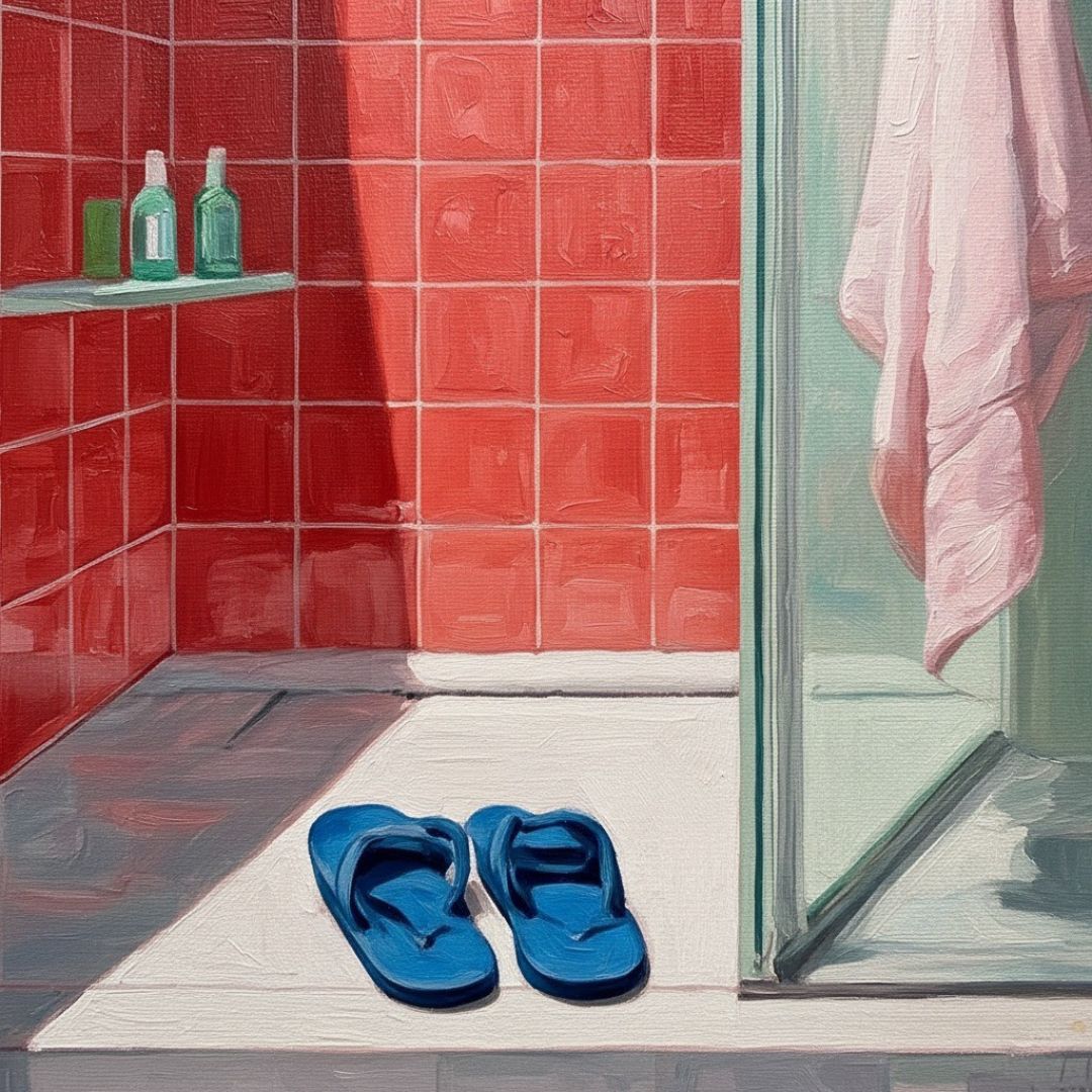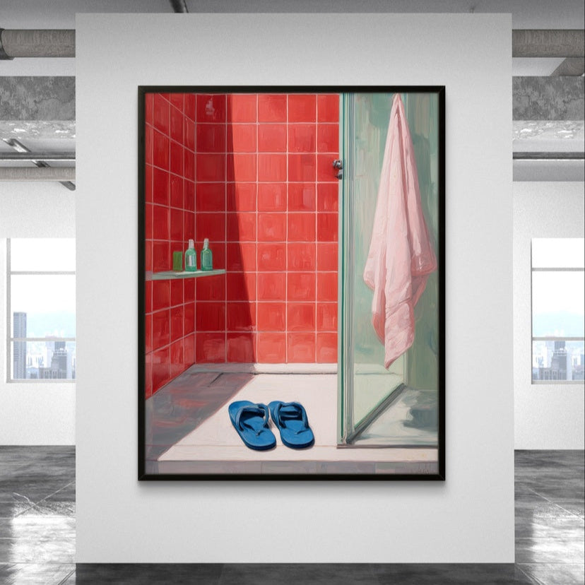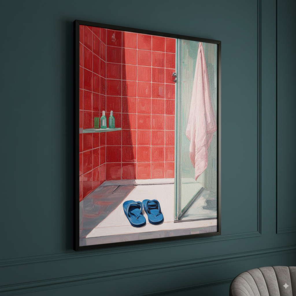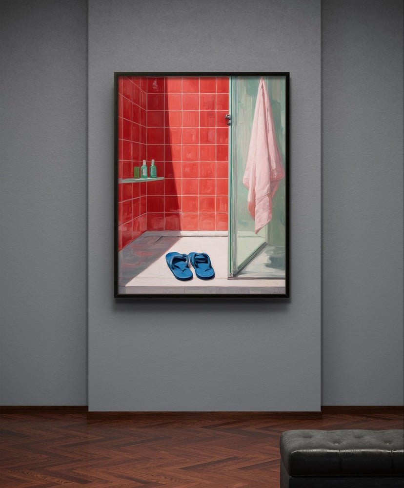 Holiday Vibe fängt die ruhige Intimität eines Sommerurlaubs ein. Die leuchtend roten Fliesen, die blauen Hausschuhe und das weiche Handtuch erinnern an sonnige Tage, erfrischende Duschen und die anhaltende Wärme der Freizeit. Es ist ein alltäglicher Moment, der in eine zeitlose Erinnerung an unbeschwerte Ferien verwandelt wird.