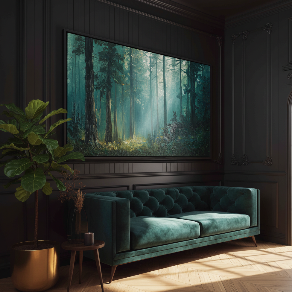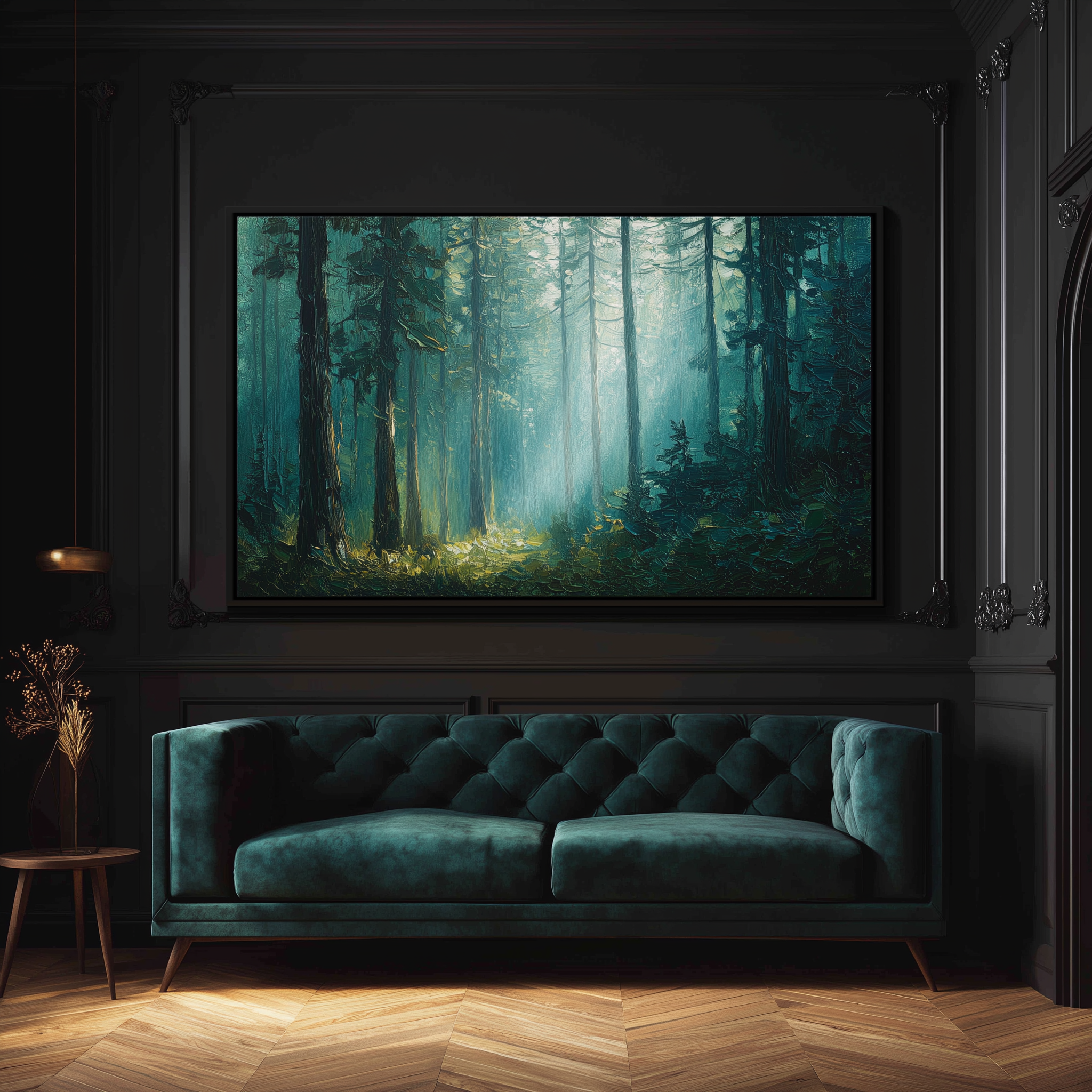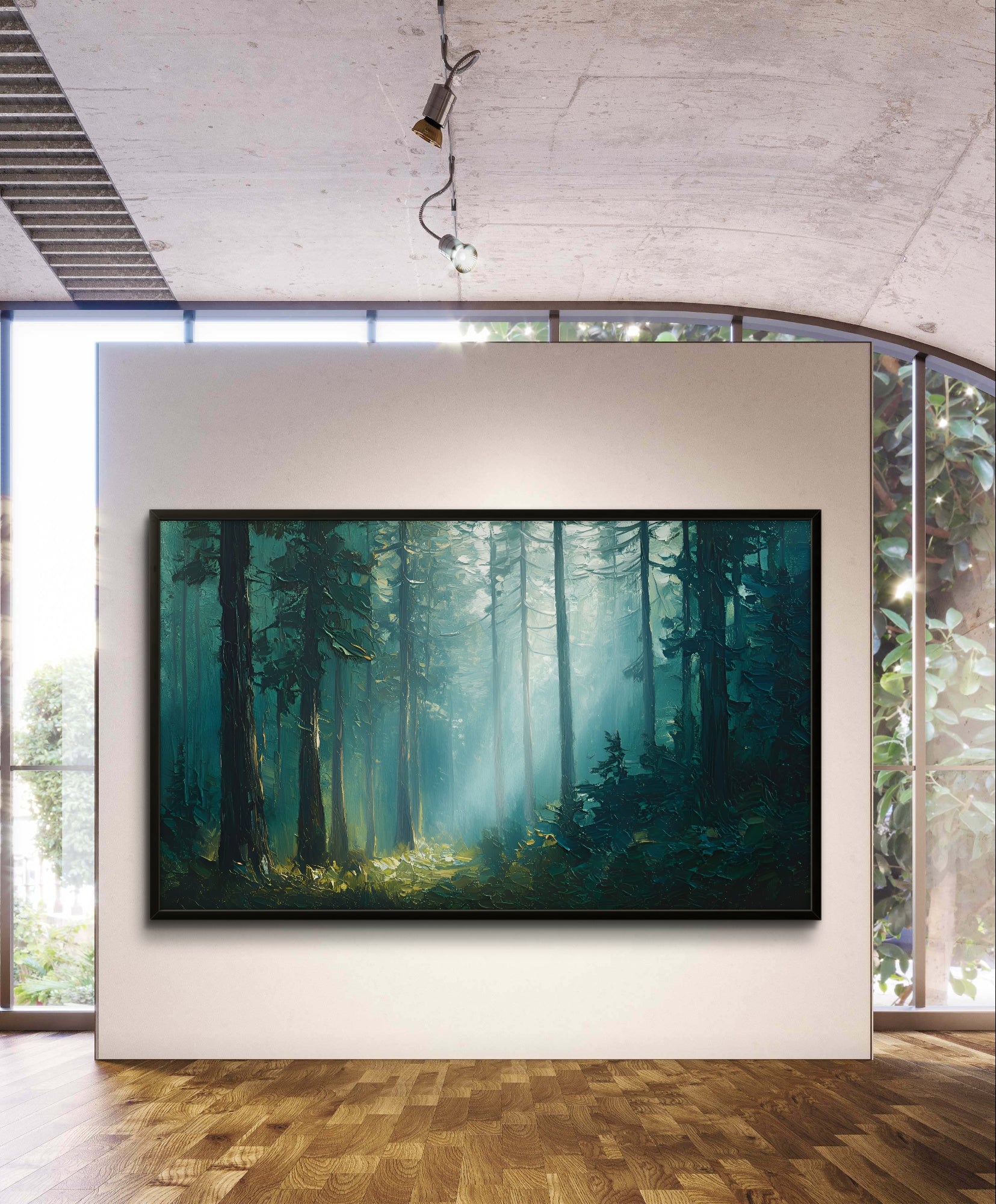 In sanfte Morgenstrahlen getaucht, fängt „Joy Among Trees“ die pure Ruhe eines erwachenden Waldes ein. Jeder Pinselstrich ruft Erneuerung, Frieden und die erhebende Energie der Natur hervor und lädt den Betrachter ein, ein Heiligtum zu betreten, in dem stille Freude zwischen hoch aufragenden immergrünen Bäumen blüht.