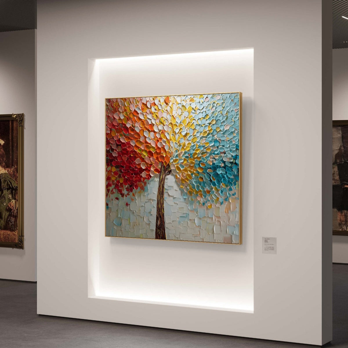 „Joyful Tree“ sprüht vor lebendiger Energie. Seine dicken, strukturierten Blätter leuchten in leuchtenden Rottönen, goldenen Gelbtönen und ruhigem Blau. Jede Farbe symbolisiert eine Jahreszeit und verschmelzt zu einer harmonischen Feier der Schönheit des Lebens. Ein haptisches Meisterwerk, das Wärme, Optimismus und einen Hauch von Naturzauber in jeden Raum bringt.