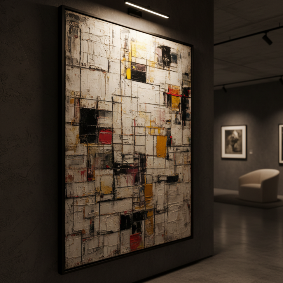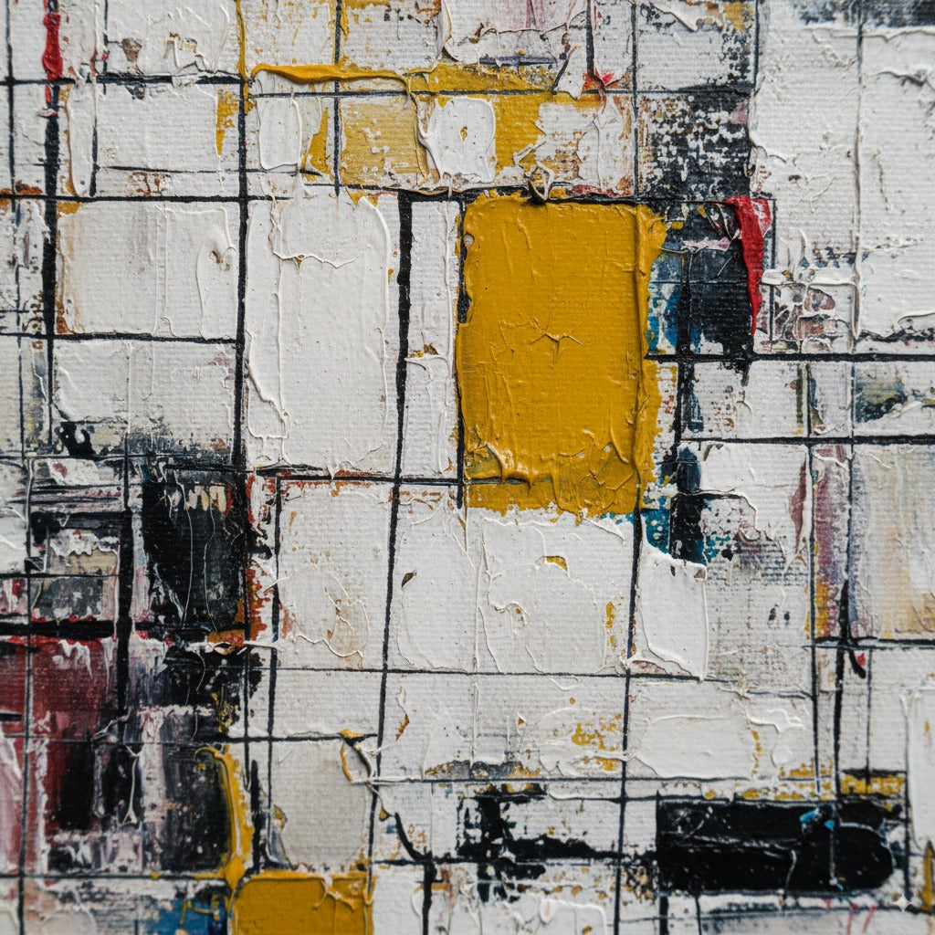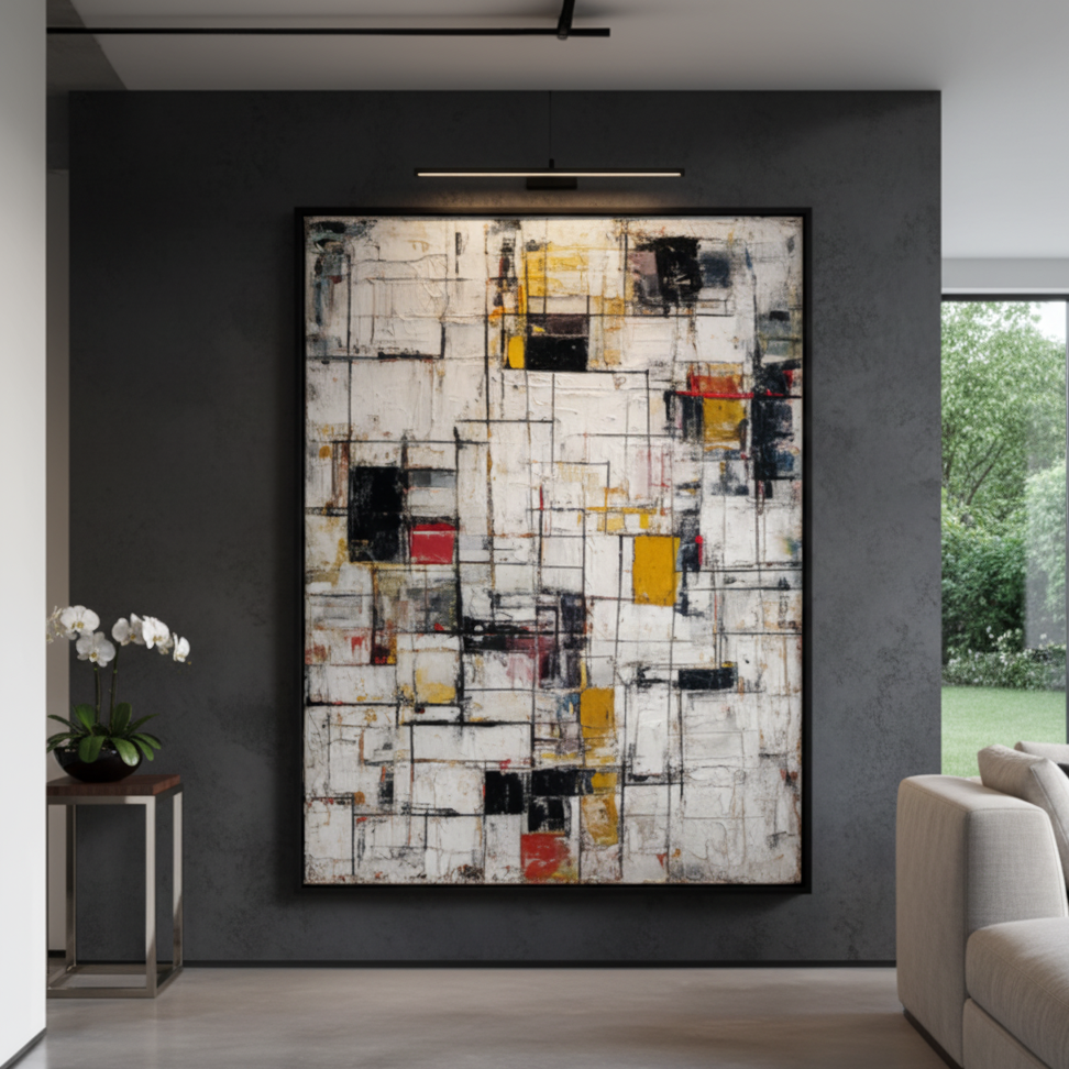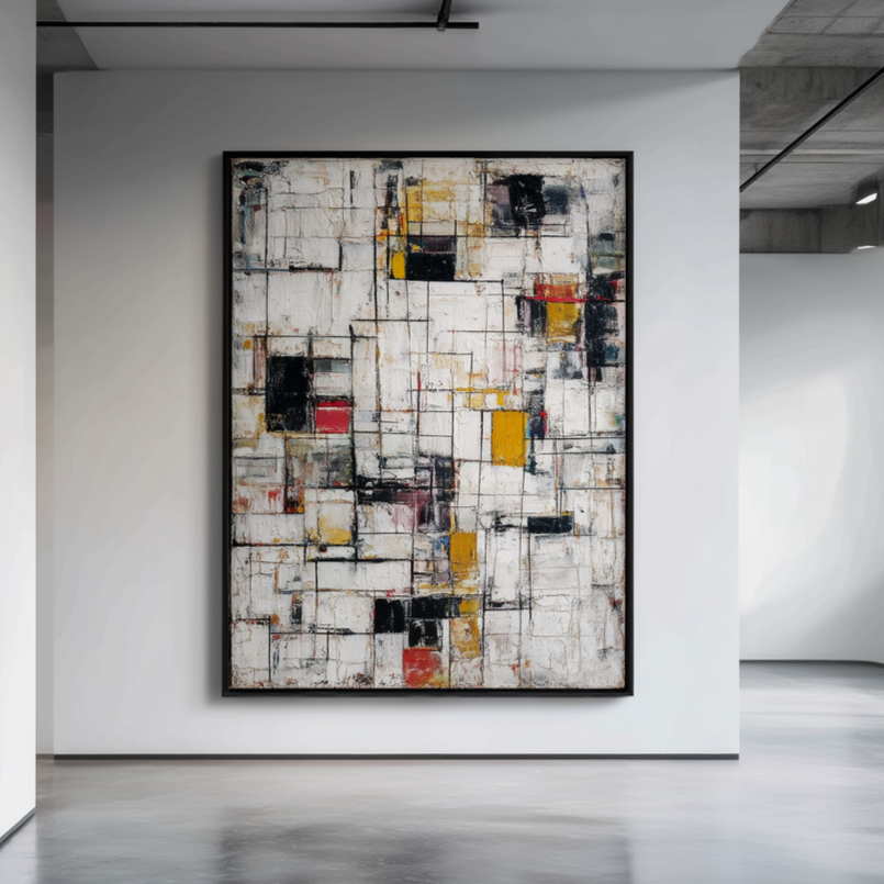„Living Structures“ ist eine Hommage an Ordnung und Vitalität in einem. Die sich kreuzenden Linien und kräftigen Farbblöcke suggerieren eine lebendige Architektur, ein Gerüst, das wächst, sich anpasst und vor Energie atmet. Es erinnert daran, dass auch innerhalb der Struktur ständige Erneuerung und Harmonie herrschen.