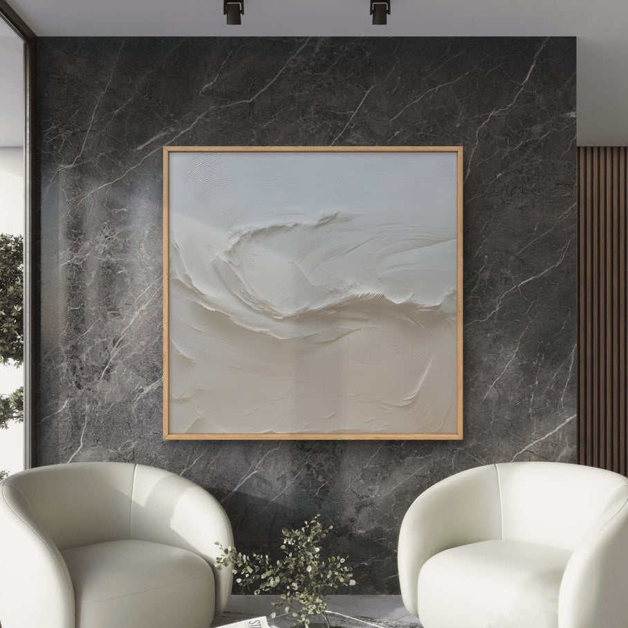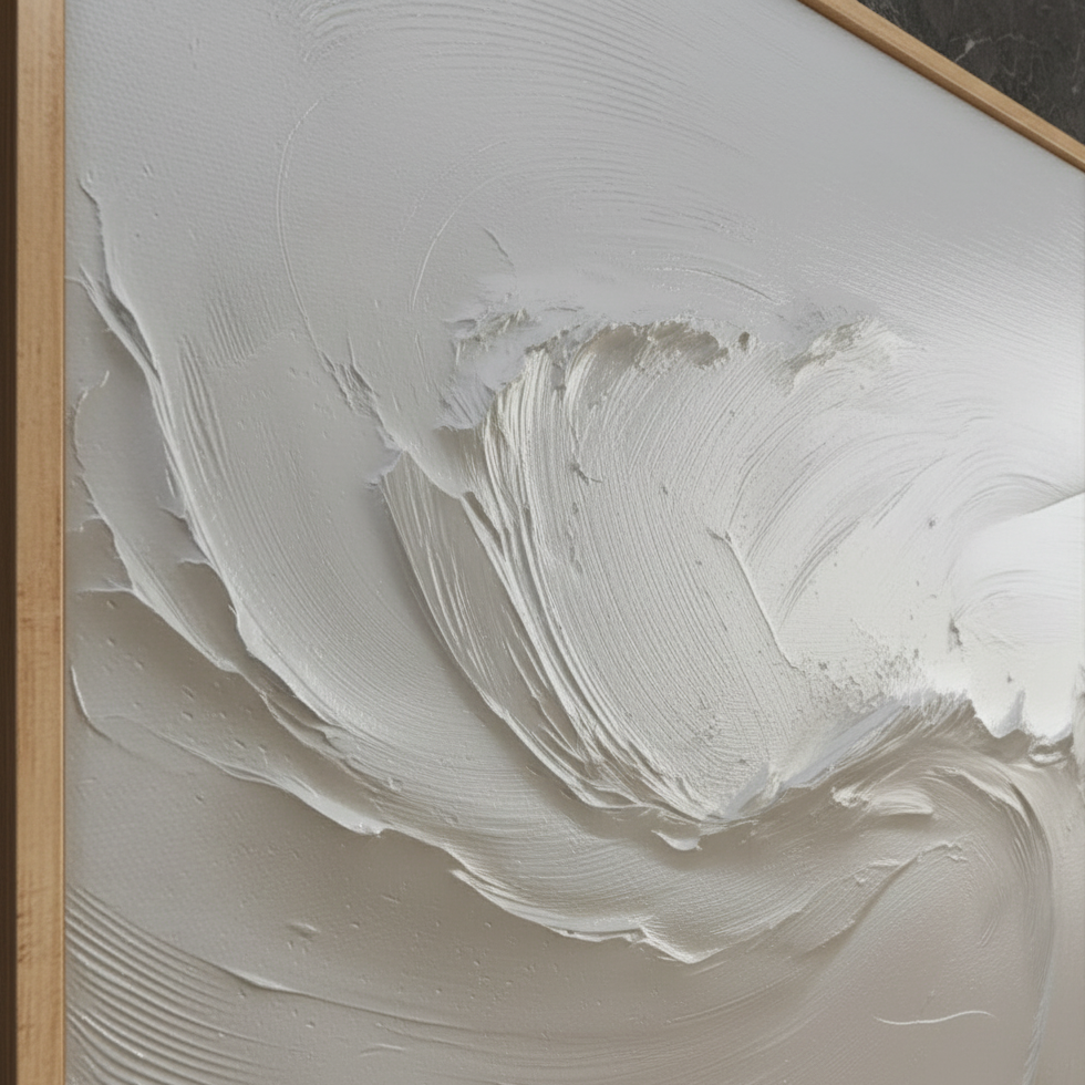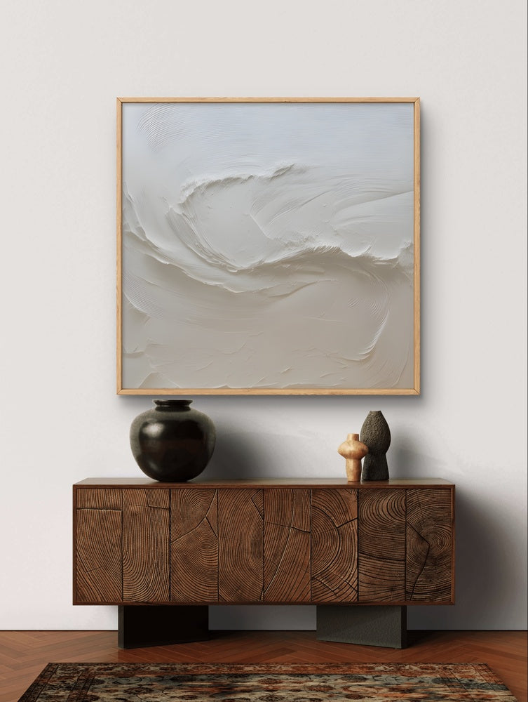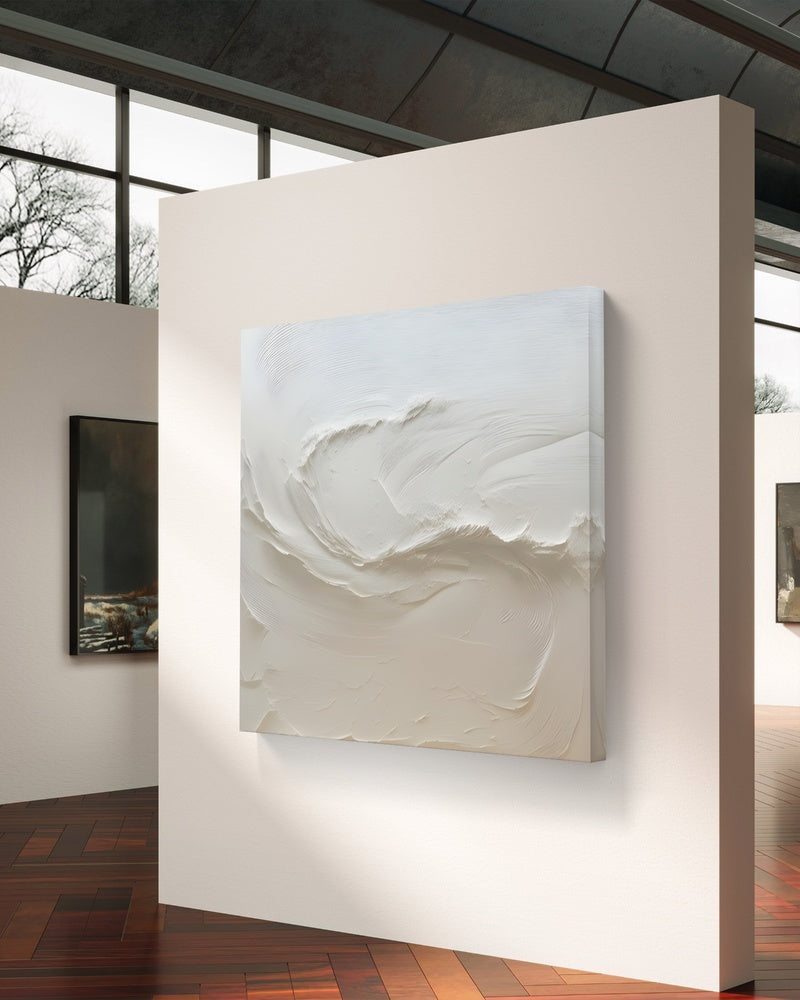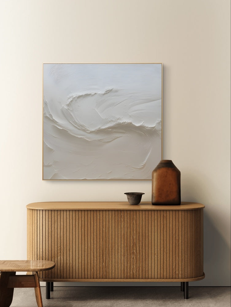 „Lunar Tides“ fängt die ruhige Anziehungskraft mondbeschienenen Wassers ein, dargestellt in zarten Texturen aus reinem Weiß. Sanfte Wellen scheinen auf der Leinwand zu steigen und zu fallen und erzeugen einen ruhigen Rhythmus, der die Sinne beruhigt. Ein minimalistisches Statement-Stück, das Ruhe und raffinierte Eleganz ausstrahlt, perfekt für moderne Interieurs, die Ruhe suchen.