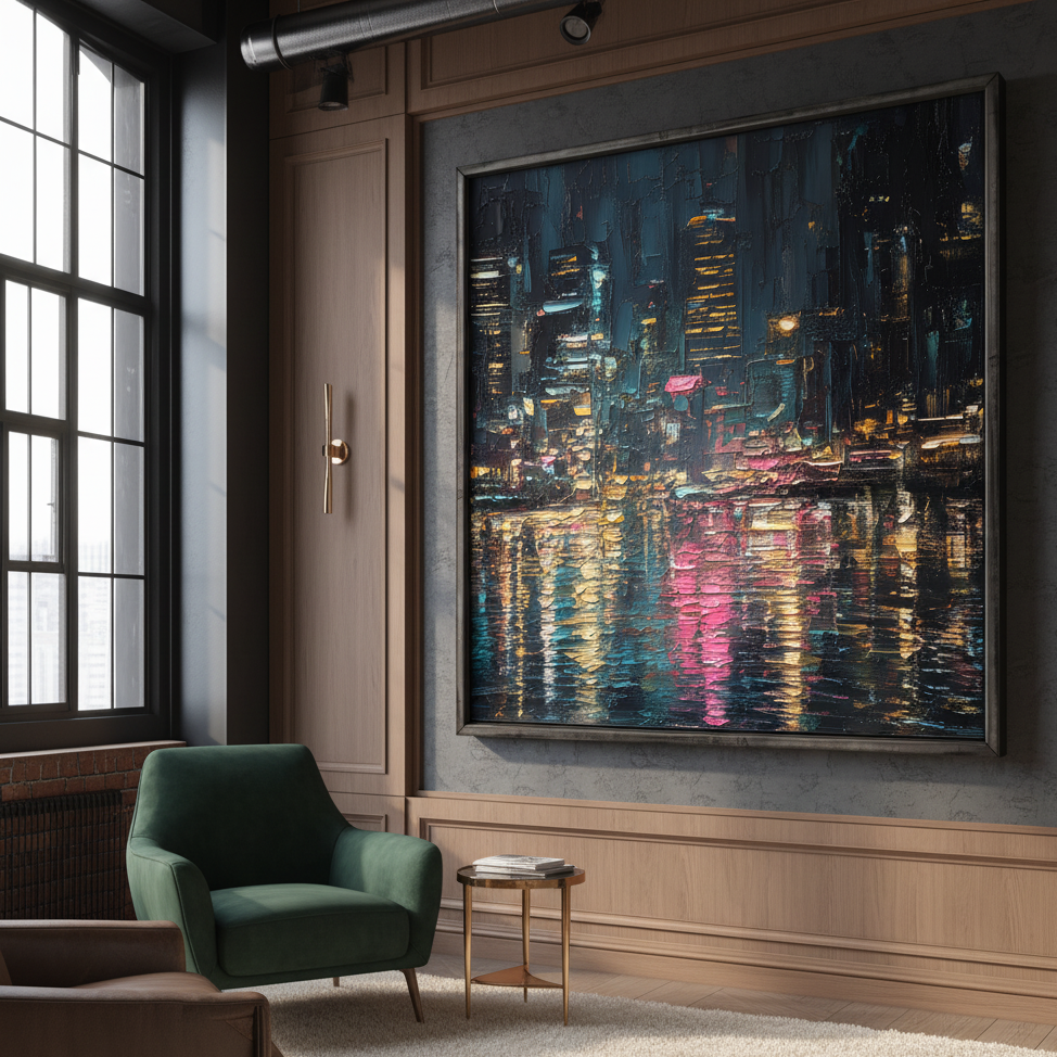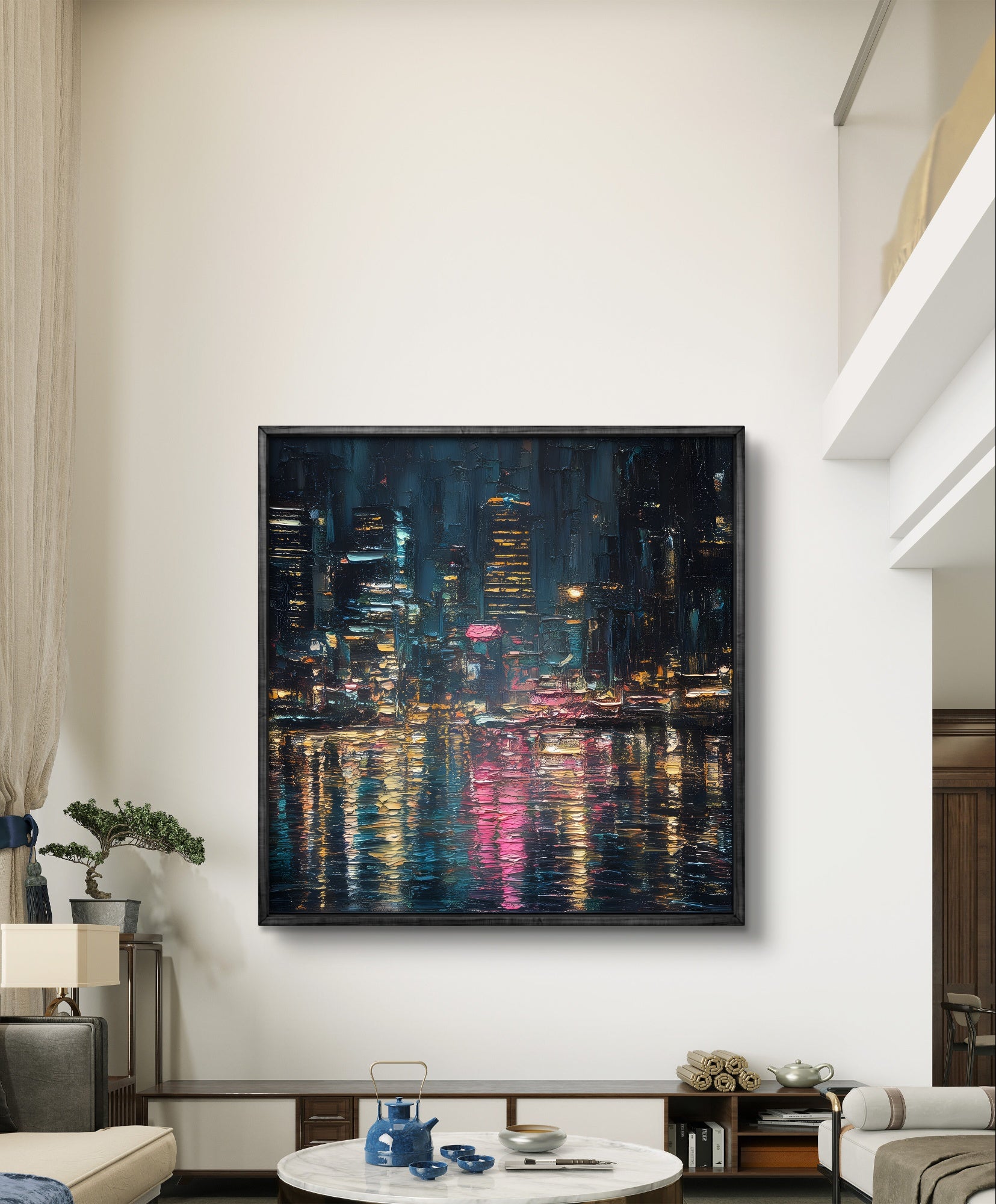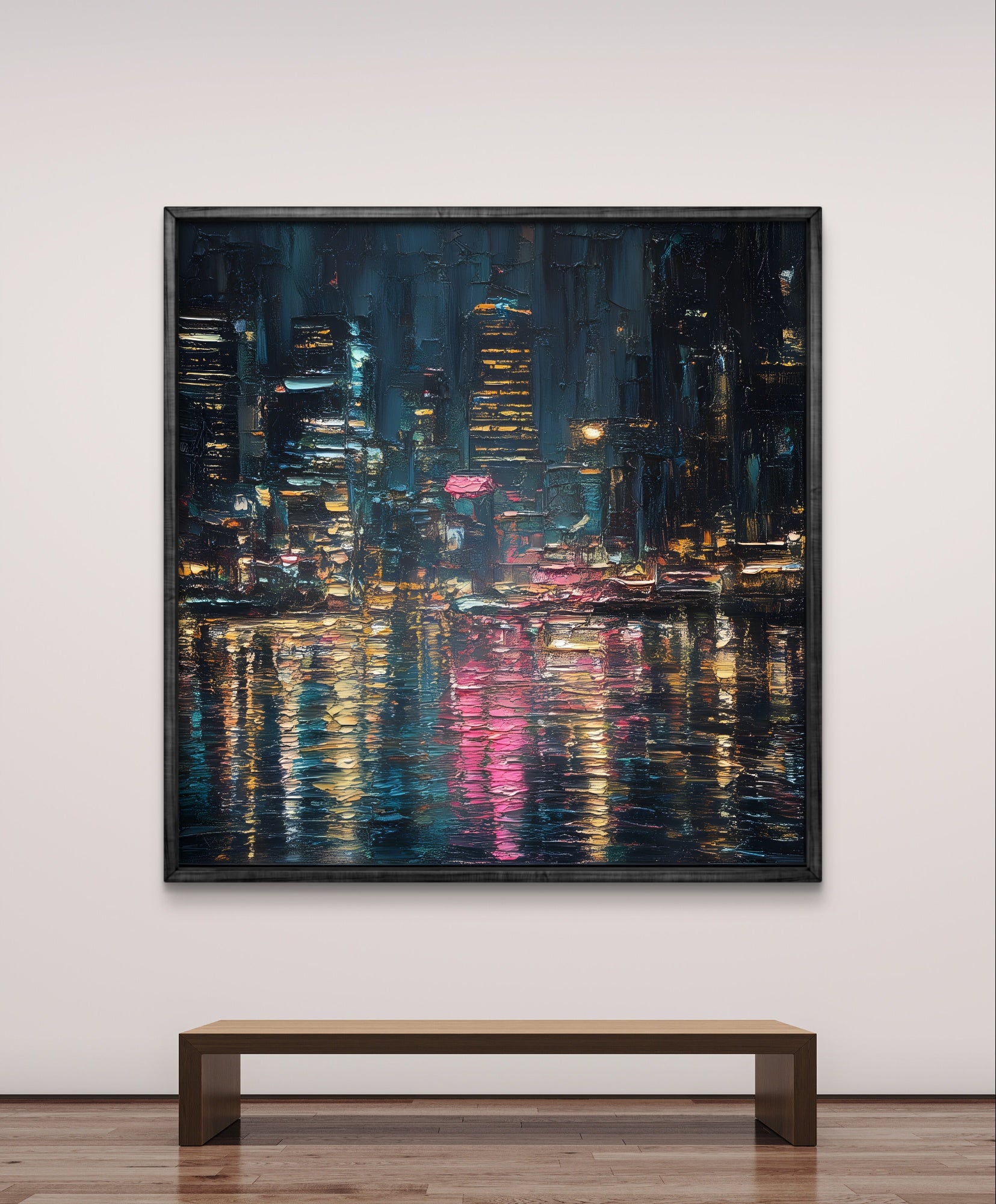 „Metropolitan Pulse“ fängt den pulsierenden Rhythmus einer Stadt bei Nacht ein, wo schimmernde Lichter auf dem Wasser tanzen und hoch aufragende Silhouetten sich gegen die Dunkelheit abheben. Jeder Pinselstrich strahlt die Energie des urbanen Lebens aus, ein Fest der Bewegung, der Farbe und des Herzschlags der Metropole.