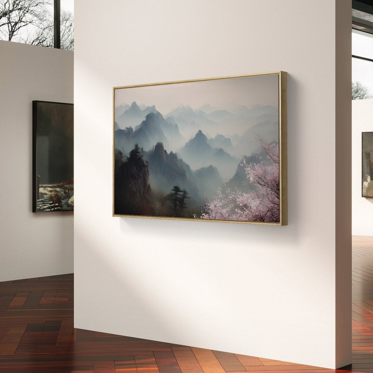 Sanfte Nebelschwaden ziehen über uralte Gipfel, wo Kirschblüten den Frühlingsanfang ankündigen. Diese ruhige Landschaft lädt den Betrachter ein, innezuhalten, durchzuatmen und in ihre stillen Tiefen einzutauchen.