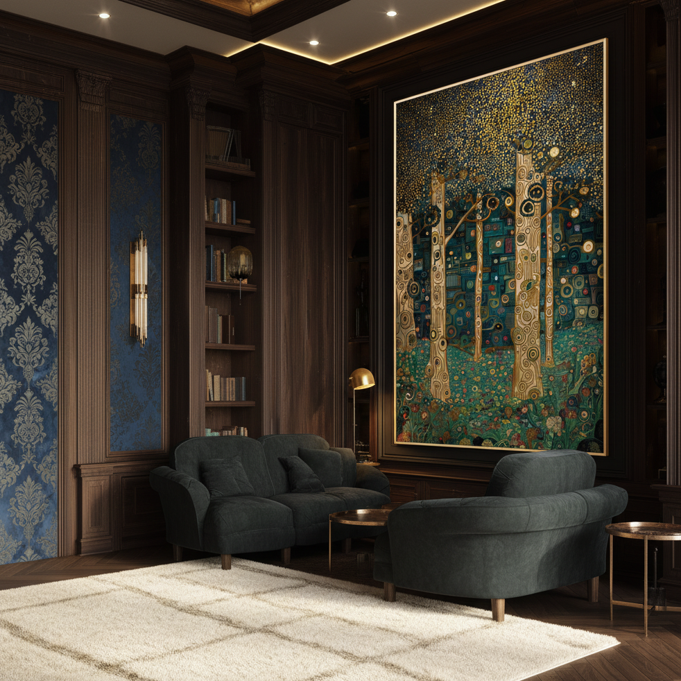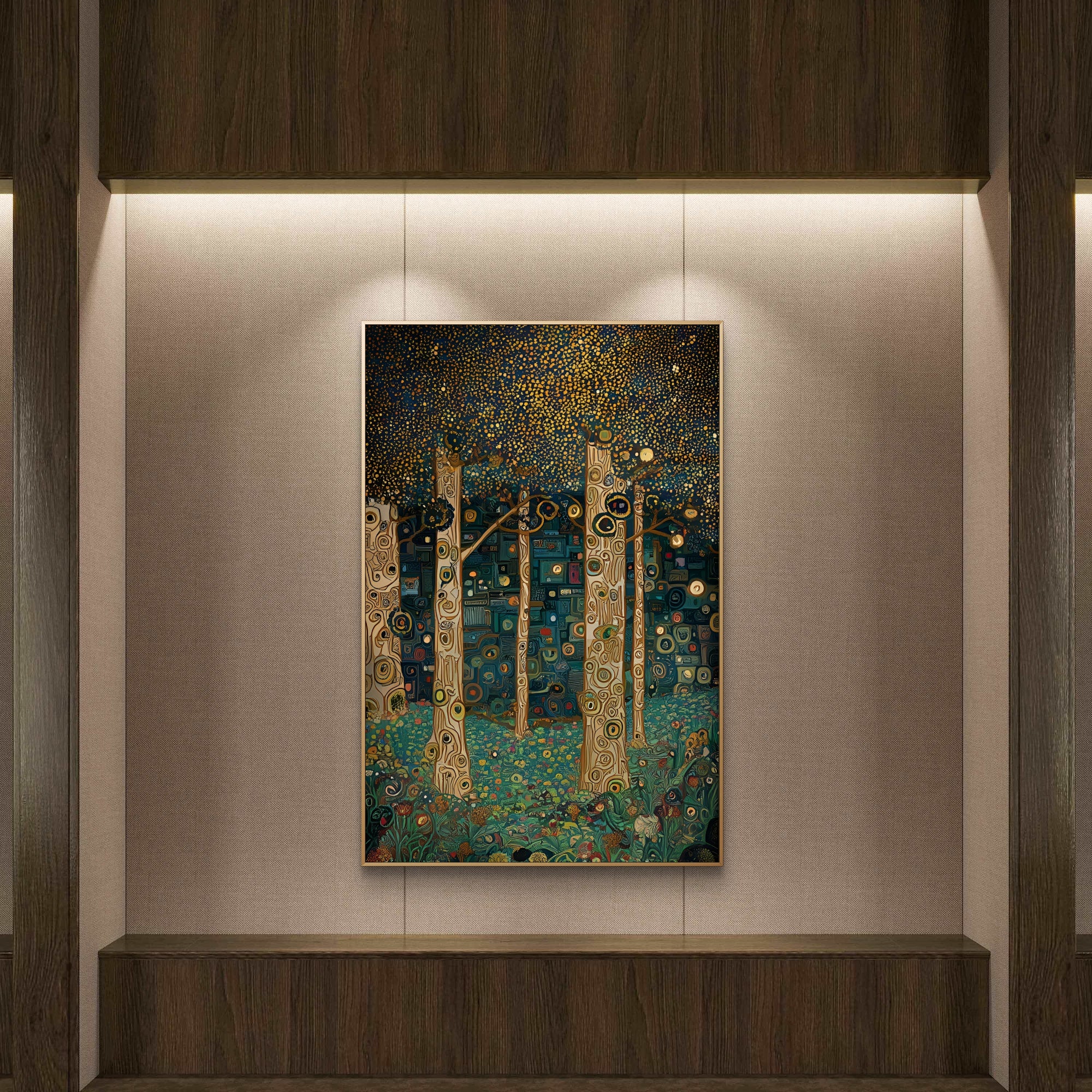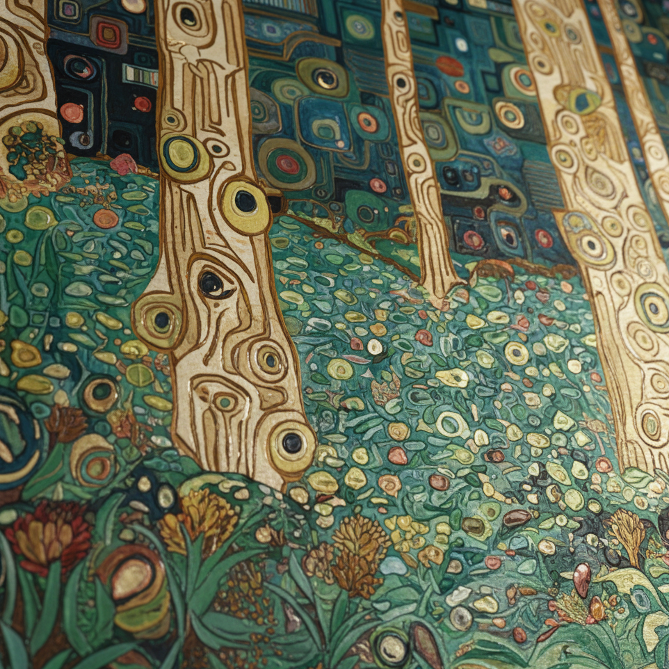 „Mystic Woodland“ zeigt einen Wald, in dem Natur und Ornament miteinander verschmelzen. Goldene Stämme ragen aus einer üppigen Wiese, während ein Baldachin aus schimmernden Punkten an eine sternenklare Nacht erinnert. Reich an Textur und Detail lädt dieses Werk den Betrachter in eine traumhafte Welt ein, in der die Natur zeitlos und verzaubert wirkt.