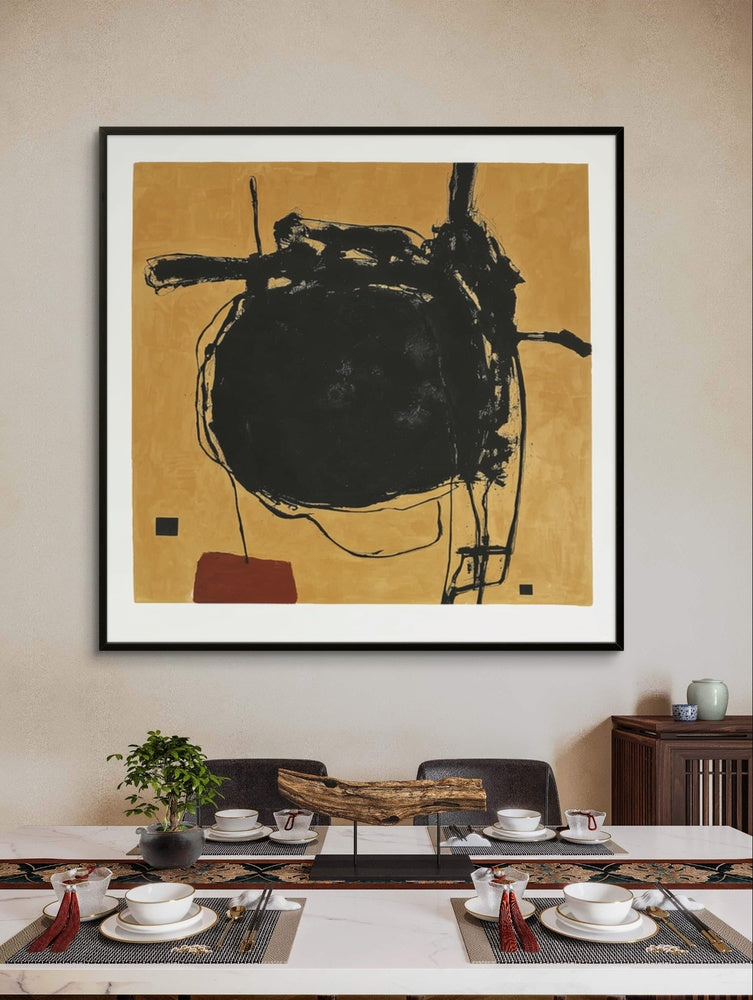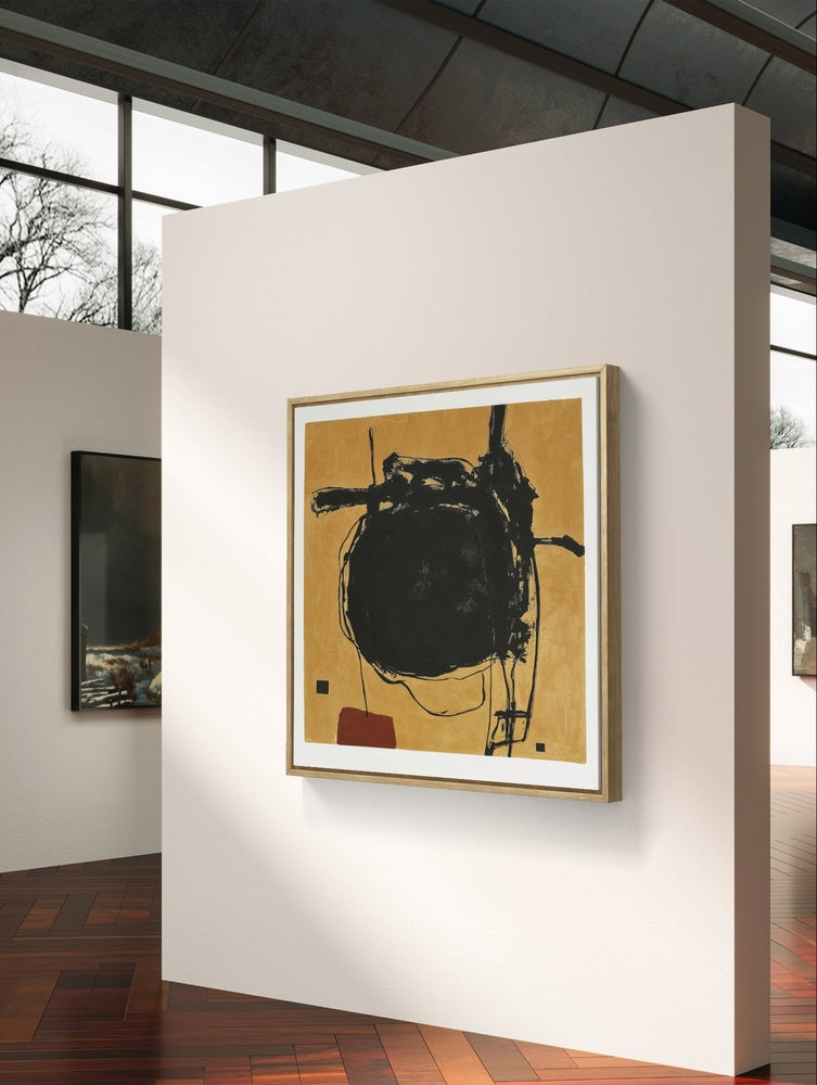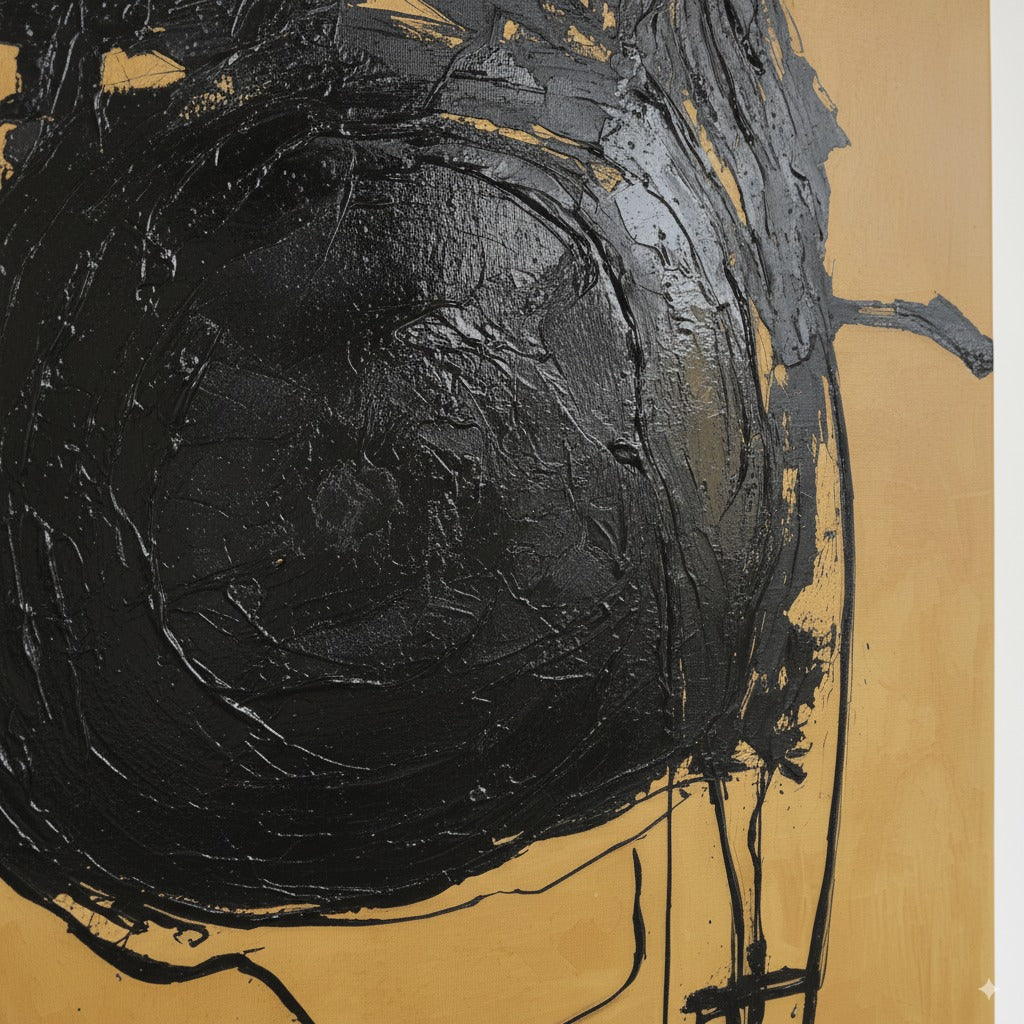 „Obsidian Orbit“ besticht durch sein markantes Zusammenspiel von tiefem Schwarz und warmem Ocker, eine kühne abstrakte Komposition, die die Anziehungskraft unsichtbarer Kräfte evoziert. Die dynamischen Formen und die strukturelle Tiefe des Werks erzeugen einen visuellen Rhythmus, der zugleich verankert und in Bewegung wirkt und ein anspruchsvolles Statement für den modernen Sammler darstellt.