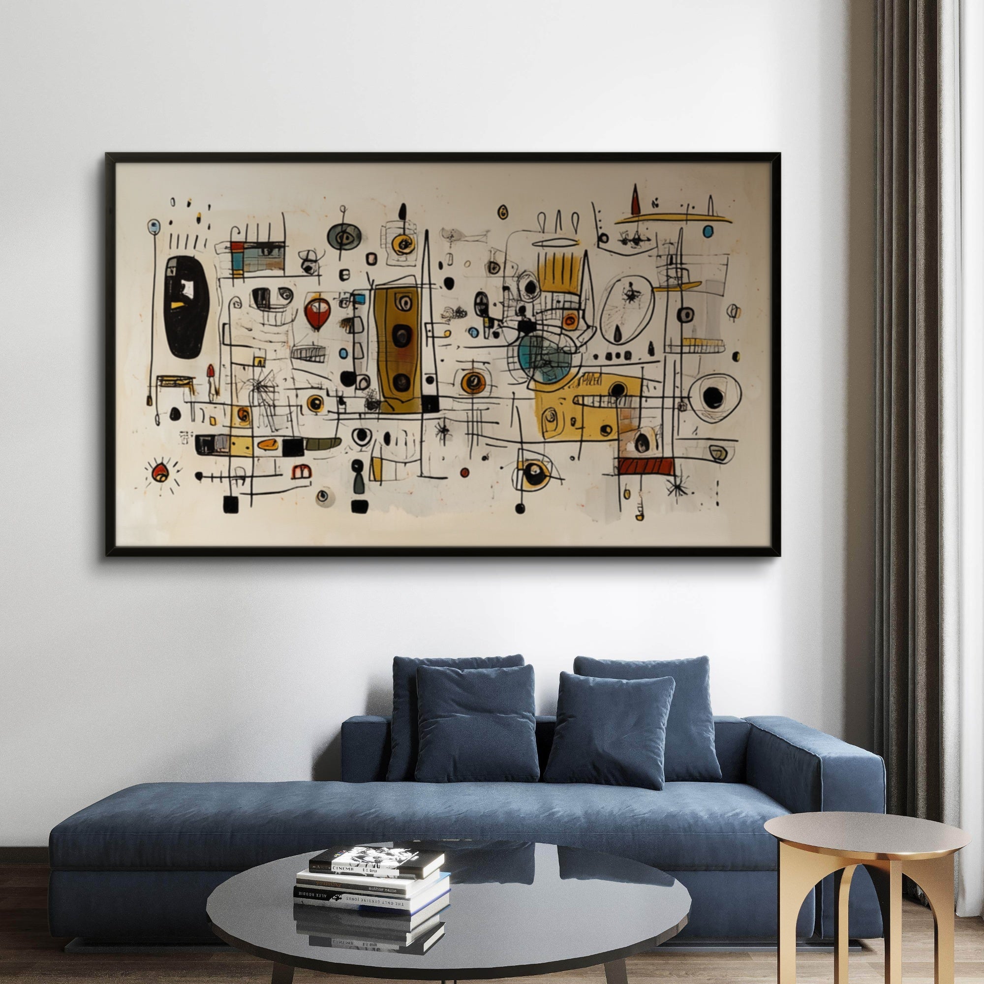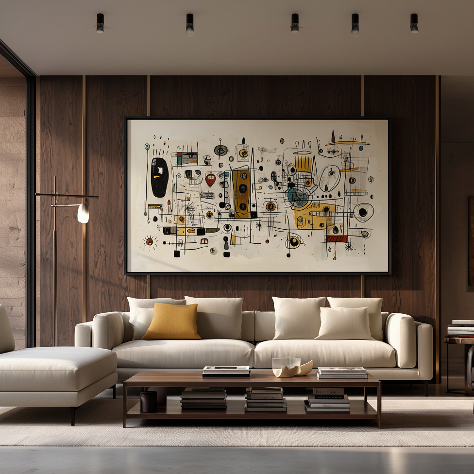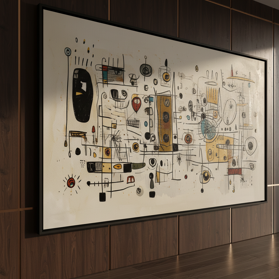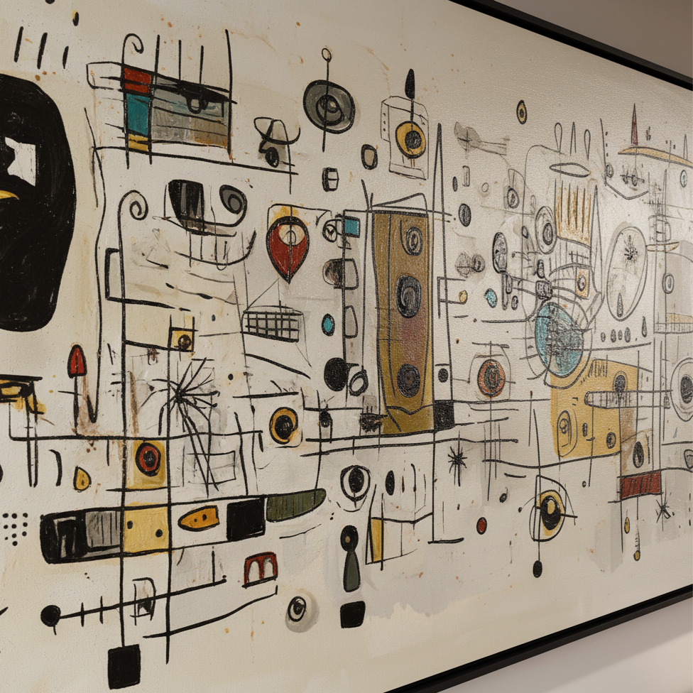 Ein dynamisches Zusammenspiel aus Linien, Formen und goldenen Akzenten bildet ein fesselndes Netzwerk, das sowohl kosmisch als auch urban wirkt. Orbiting Thoughts lädt Sie zu einem visuellen Dialog aus Bewegung und Bedeutung ein, in dem jedes Detail den ständigen Fluss der Ideen suggeriert, die unsere Welt verbinden.