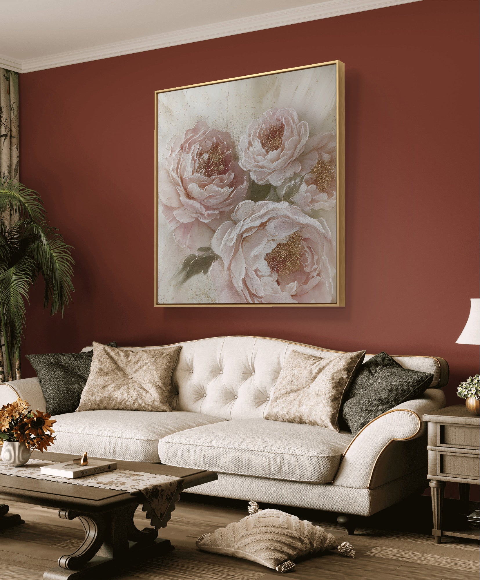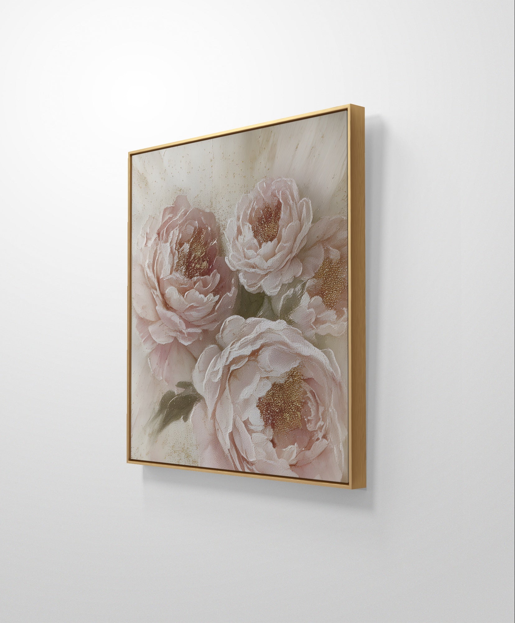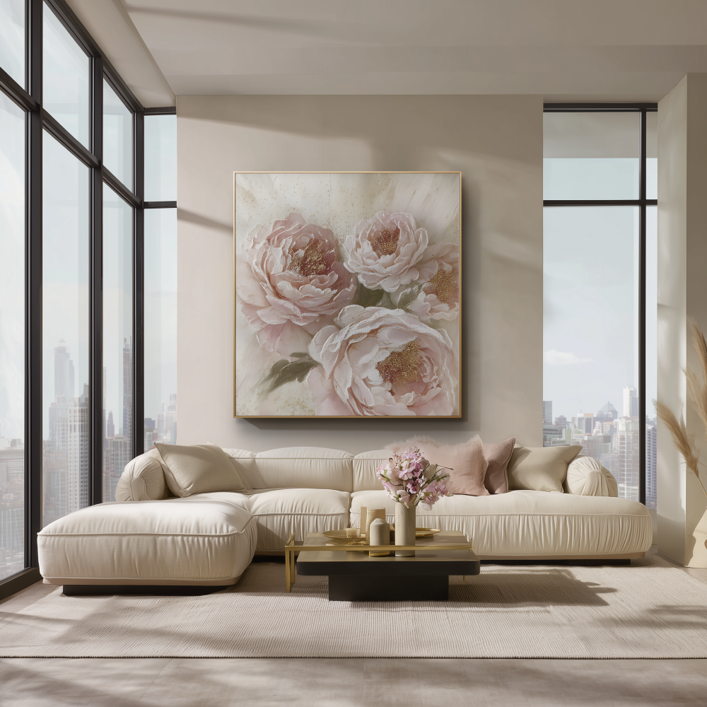„Poetry in Petals“ fängt die zeitlose Schönheit zartrosa Pfingstrosen in voller Blüte ein, jede zarte Schicht mit goldenen Akzenten. Sanft und romantisch strahlt dieses Stück Gelassenheit und Anmut aus und verleiht jedem eleganten Interieur einen Hauch von Naturpoesie.
