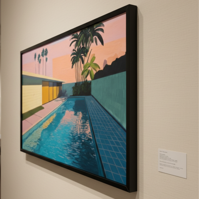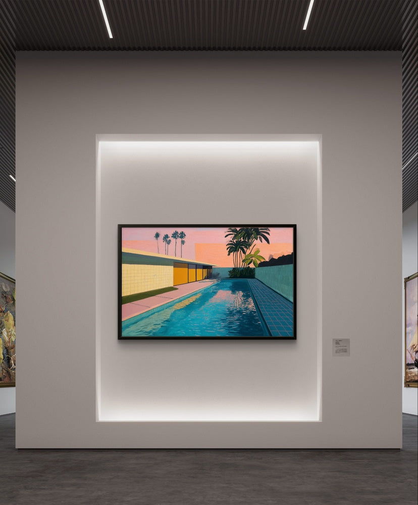 „Pool Noir“ fängt die stille Dramatik modernistischer Architektur im Licht der Dämmerung ein. Die reflektierende Stille des Wassers spiegelt den dunkelrosa Himmel, während sich die Schatten der Palmen wie stille Zuschauer hineinlehnen. Dieses Kunstwerk ruft die Stimmung eines Filmstills hervor – zeitlos, glamourös und leicht rätselhaft. Es ist nicht nur ein Gemälde, sondern eine Einladung in eine Welt, in der Mysterium und Luxus Hand in Hand gehen.