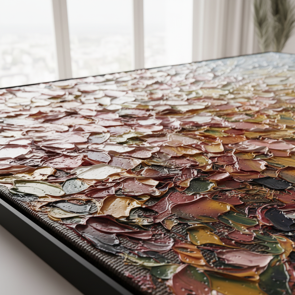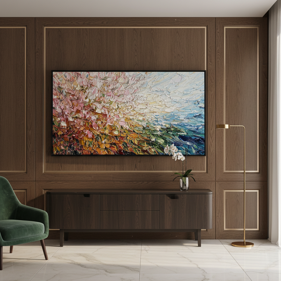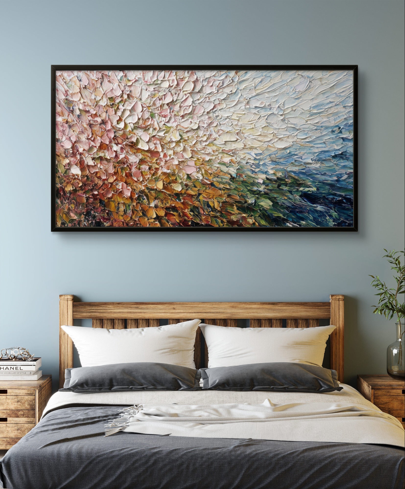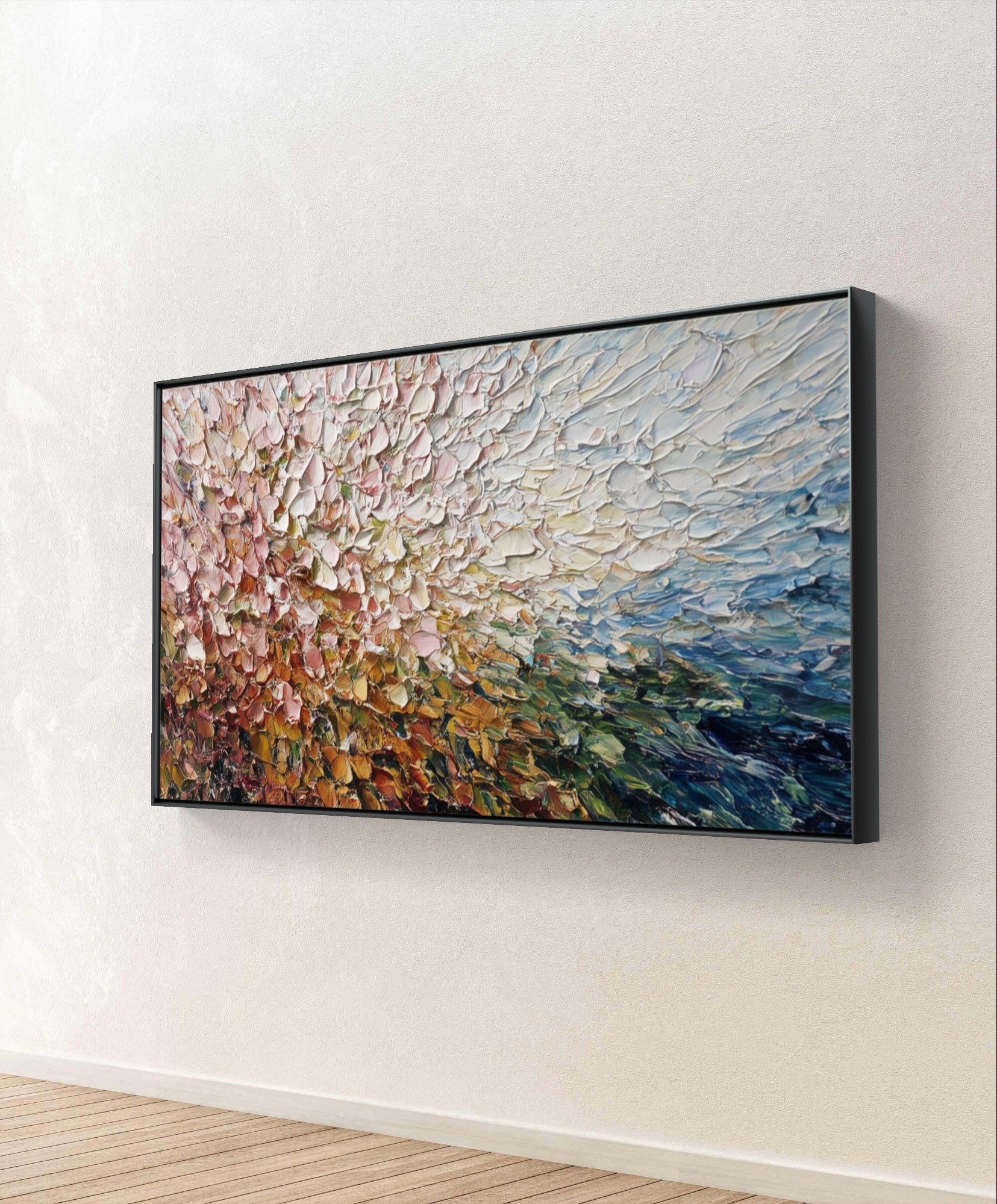 „Radiant Meadow“ blüht voller Leben und Harmonie. Strukturierte Blütenblätter und fließende Farben fangen die Schönheit der ewig blühenden Natur ein. Die Komposition erinnert an einen Sonnenaufgang über einem blühenden Feld und erfüllt Innenräume mit Wärme, Frische und heiterer Eleganz.