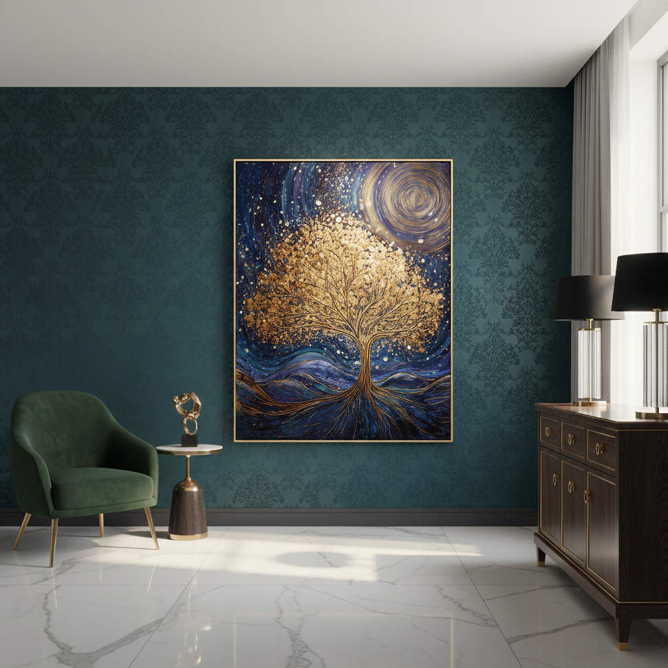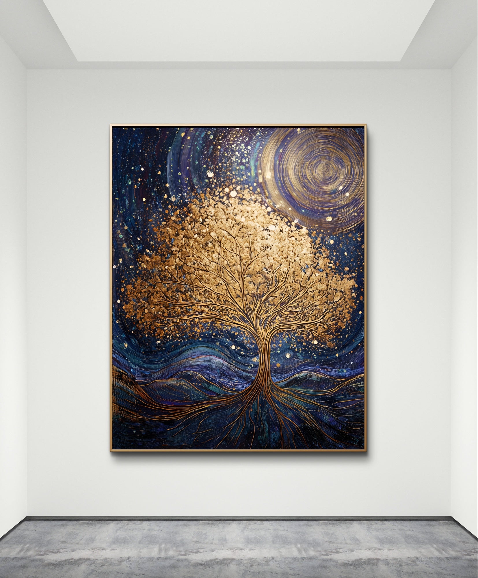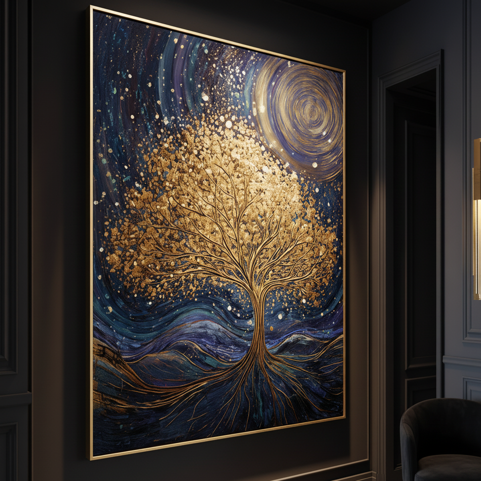 Roots of the Universe verbindet die Eleganz eines goldenen Baumes mit dem Mysterium des Kosmos. Seine strahlenden Äste strecken sich in den wirbelnden, mondbeschienenen Himmel, während sich die verschlungenen Wurzeln tief in himmlischen Wellen verankern und so Verbundenheit, Gleichgewicht und unendliche Möglichkeiten symbolisieren.