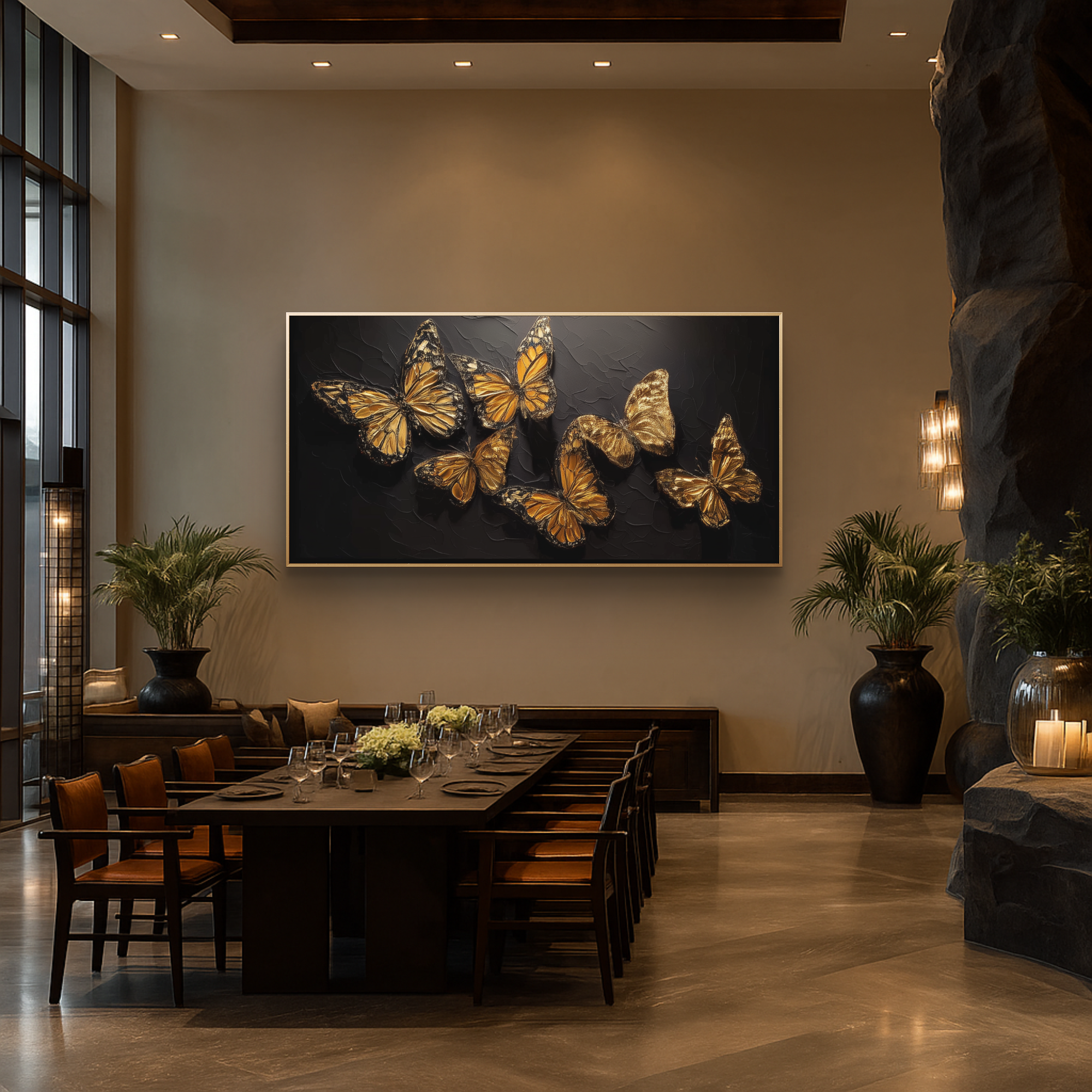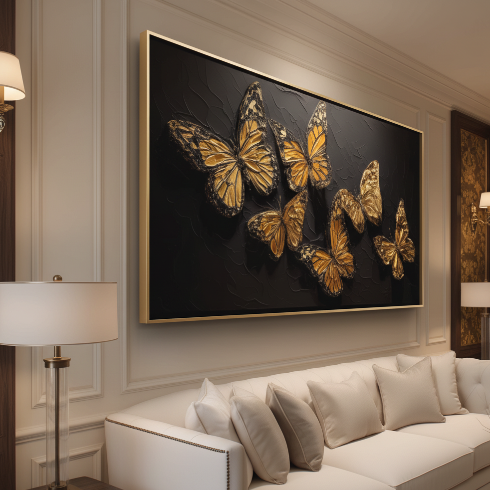 Ein hypnotisierender Tanz goldener Flügel, die über eine tiefe, mitternachtsblaue Leinwand gleiten. „Soaring Butterflies“ fängt einen flüchtigen Moment der Schönheit ein, in dem die Anmut der Natur auf zeitlose Eleganz trifft und ein Gefühl von Freiheit und Transformation hervorruft.