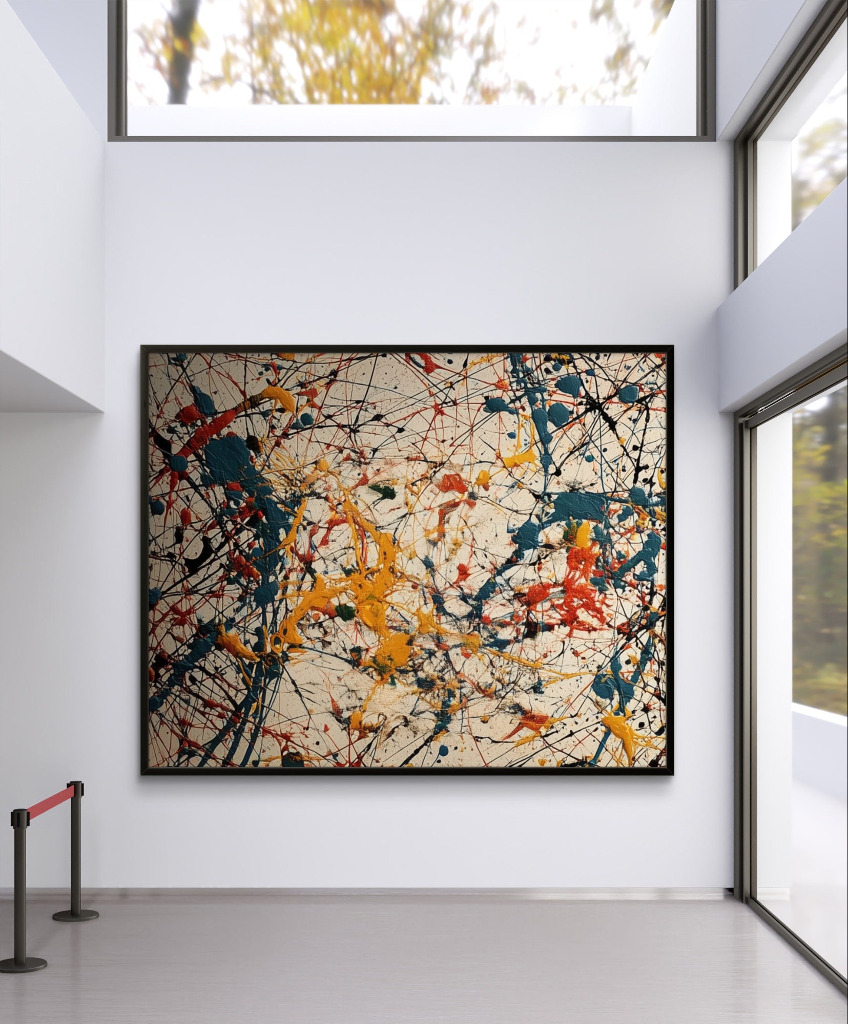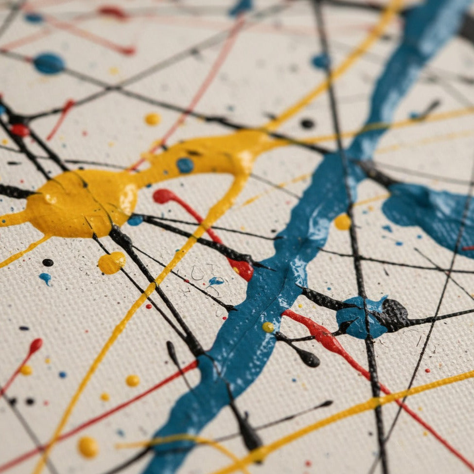 „Sparks of Existence“ ist eine lebendige Symphonie aus Bewegung und Farbe, in der jeder Farbklecks vor Energie zu sprühen scheint. Die leuchtenden Schichten aus Rot, Gelb, Blau und Schwarz prallen in einem ungezähmten Tanz über die Leinwand und verkörpern Chaos und Harmonie zugleich. Es ist ein Kunstwerk, das uns an den rohen Puls des Lebens selbst erinnert – unberechenbar, intensiv und unendlich ausdrucksstark.