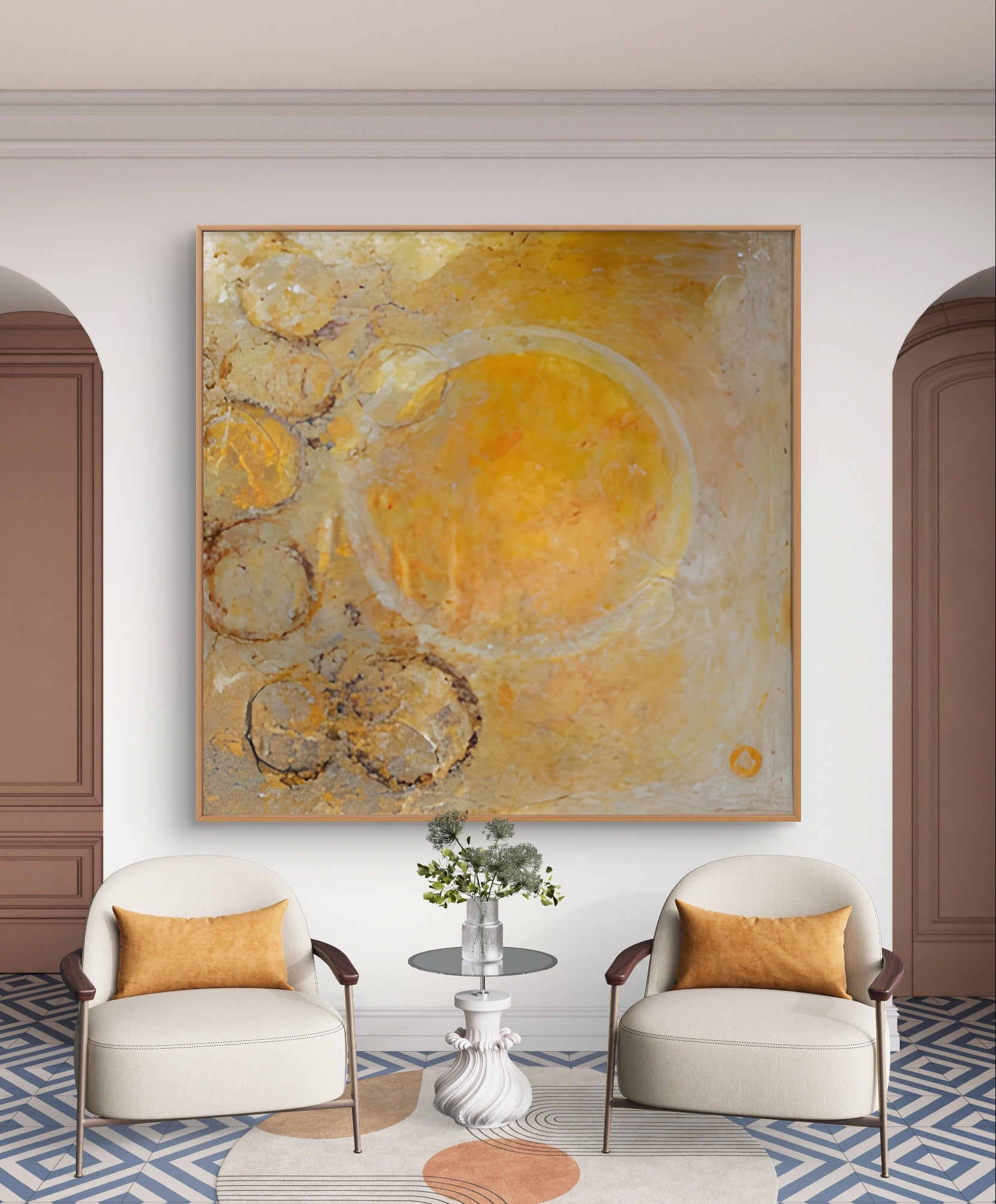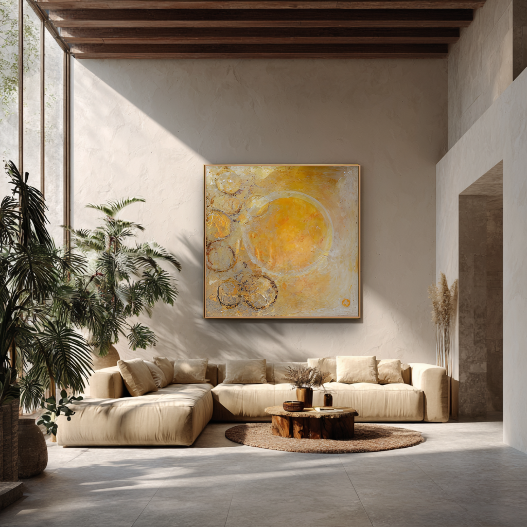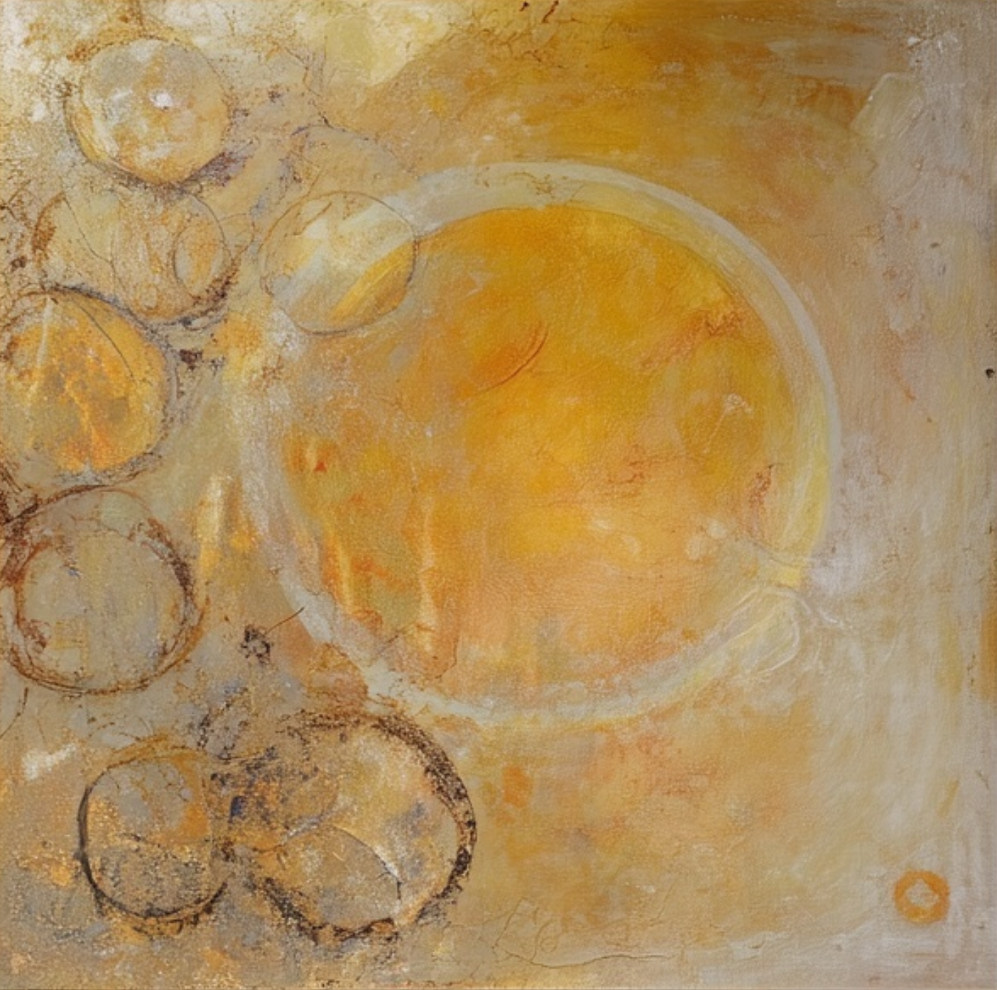 „Summer Fragments“ fängt die Wärme flüchtiger Momente ein, in denen Licht, Erinnerung und Zeit wie goldene Echos langer, sonniger Tage miteinander verschmelzen. Die vielschichtigen Texturen und kreisförmigen Formen spiegeln die Schönheit dessen wider, was bleibt: Fragmente von Freude, Gelassenheit und Zugehörigkeit, konserviert auf Leinwand.