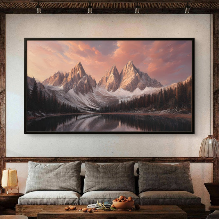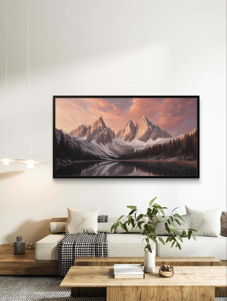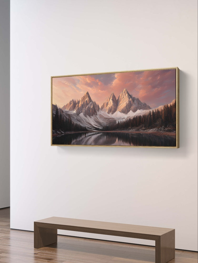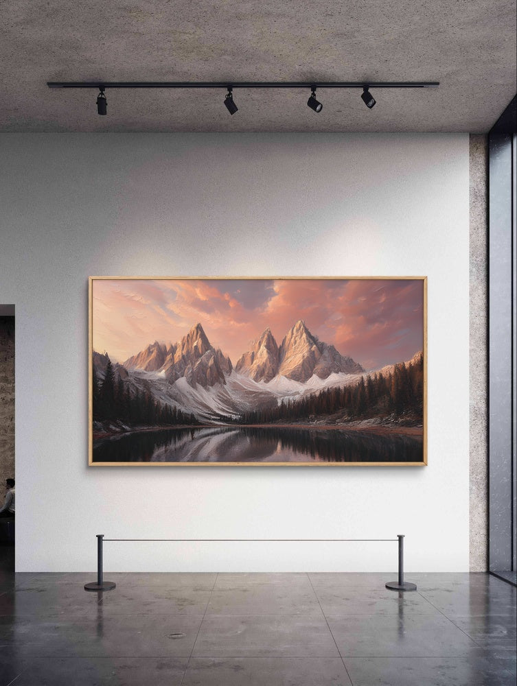„Sunset Summits“ fängt die ruhige Schönheit der Berge ein, die im warmen Abendlicht getaucht sind. Sanfte Bernstein-, Rosa- und Violetttöne streichen über die Gipfel und spiegeln sich im stillen Wasser darunter. Diese ruhige Komposition vermittelt ein Gefühl von Frieden, Staunen und einer zeitlosen Verbundenheit mit der Erhabenheit der Natur.