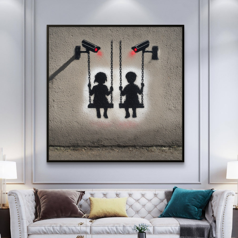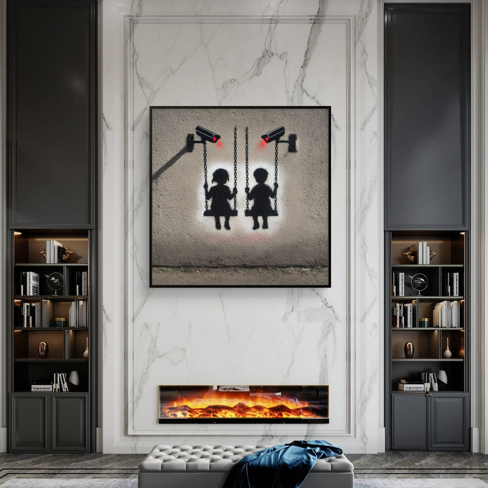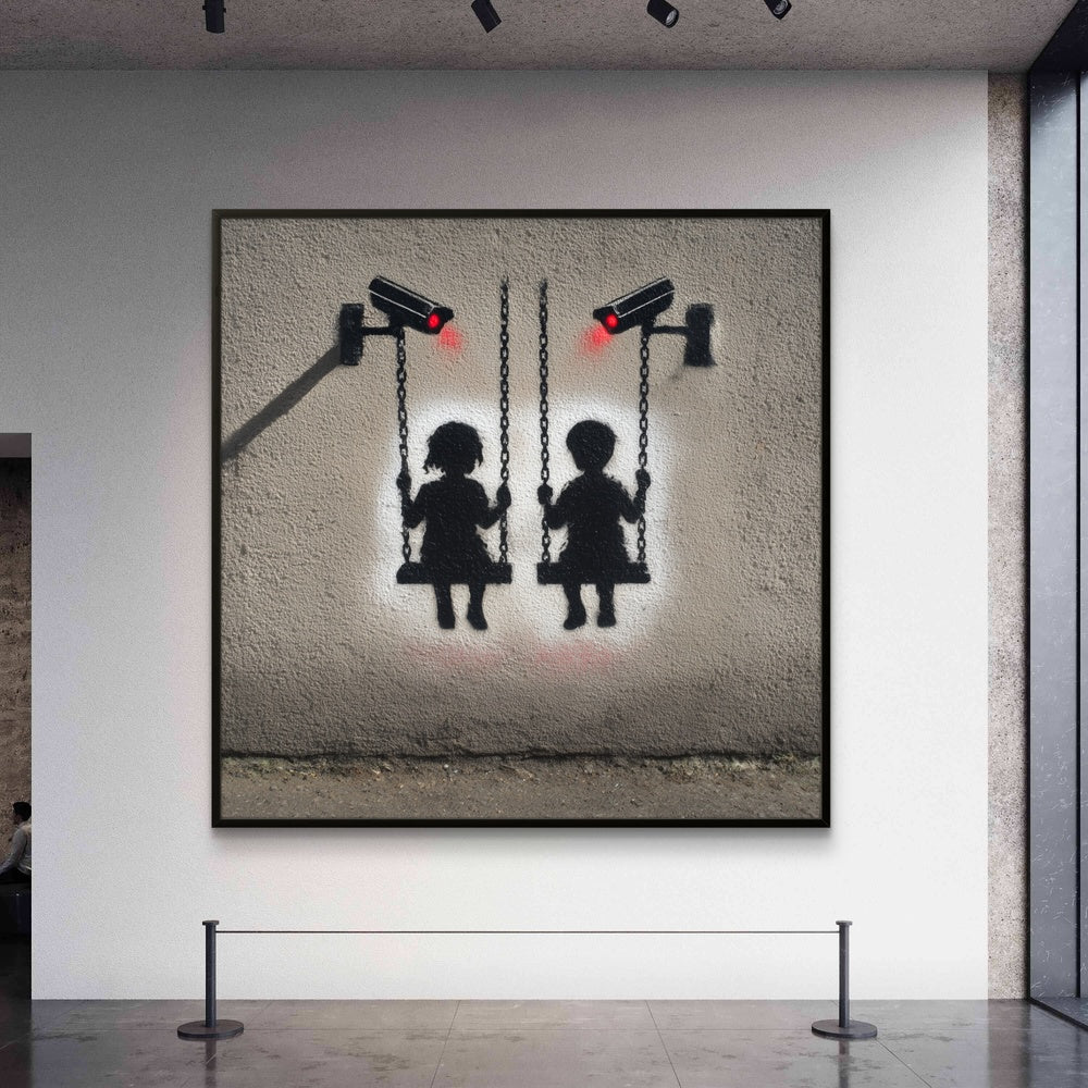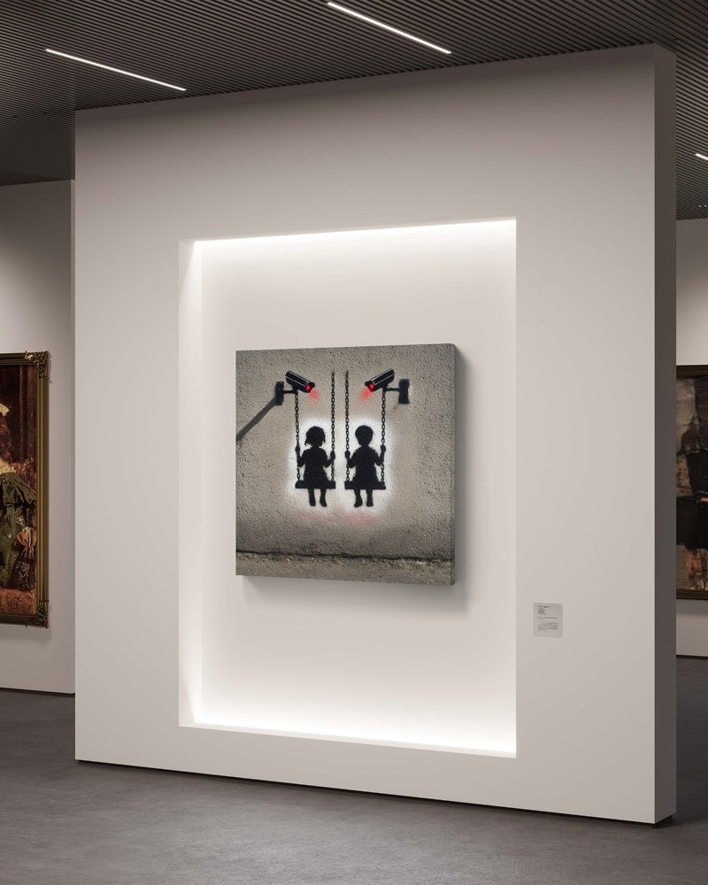 „Surveillance Playground“ stellt die Freude der Kindheit der stillen Präsenz von Kontrolle gegenüber. Zwei Kinder schaukeln frei, doch die leuchtend roten Augen der Kameras erinnern uns daran, wie Unschuld und Freiheit oft durch Beobachtung überschattet werden. Dieses Kunstwerk lädt zum Nachdenken über das Gleichgewicht zwischen Sicherheit, Freiheit und der ständigen Überwachung ein.