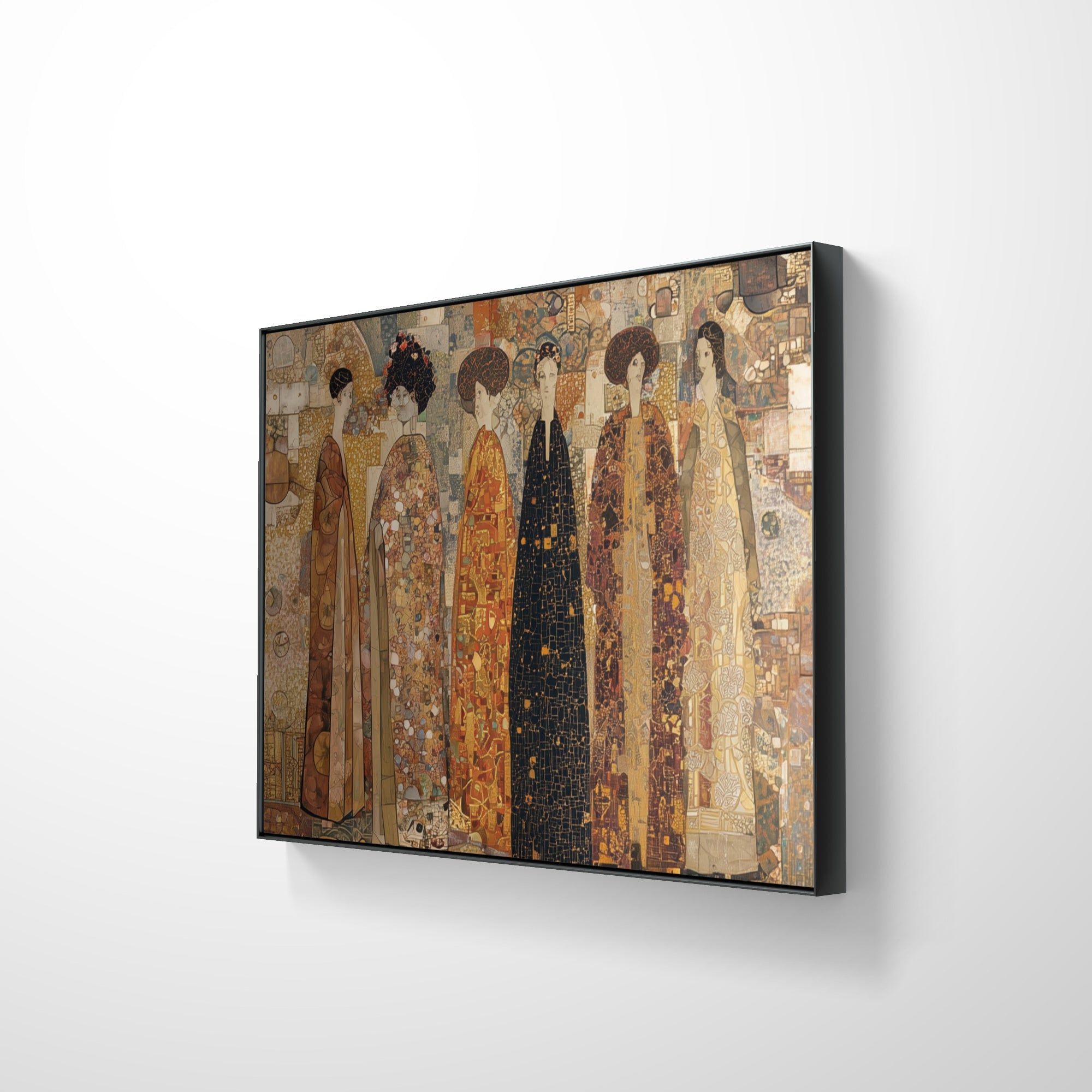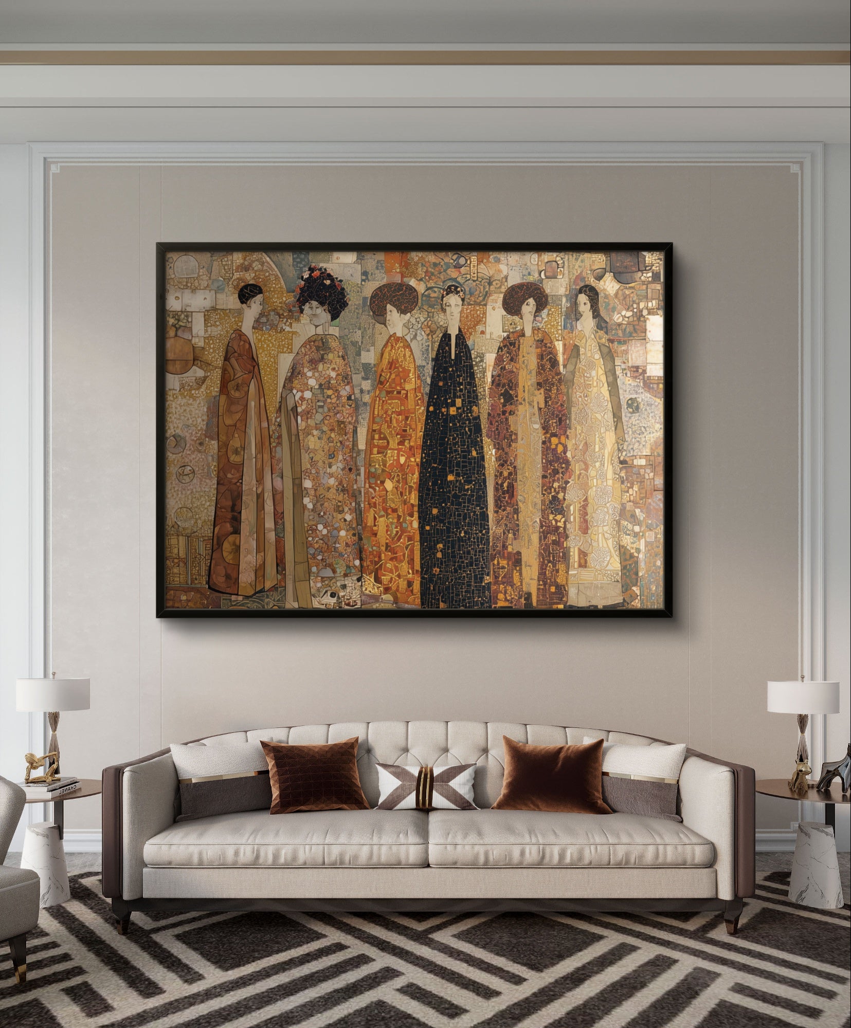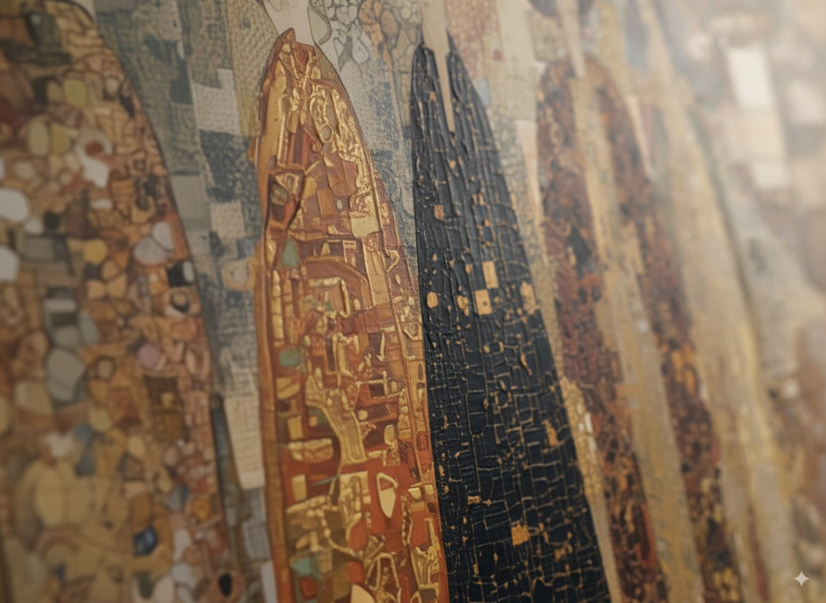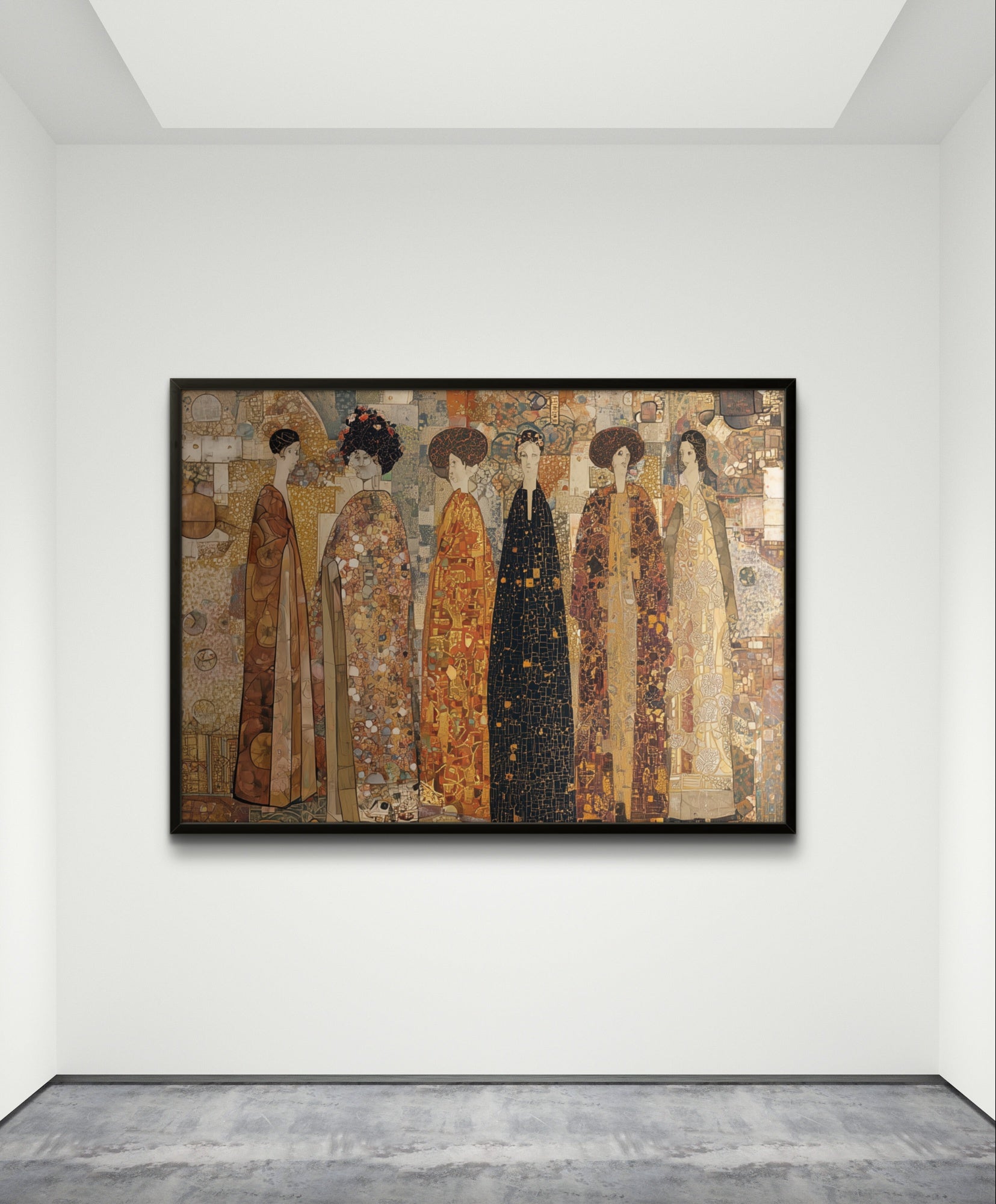 „The Imperial Gathering“ porträtiert eine Vision zeitloser Eleganz, in der sechs stattliche Figuren in kunstvollen, golddurchwirkten Gewändern stehen. Reich an Textur und Detail, erinnert diese Komposition an die Pracht kaiserlicher Höfe, die Würde der Tradition und die unvergängliche Schönheit erlesenen Erbes – perfekt für Interieurs, die Prestige und Kunstfertigkeit zelebrieren.