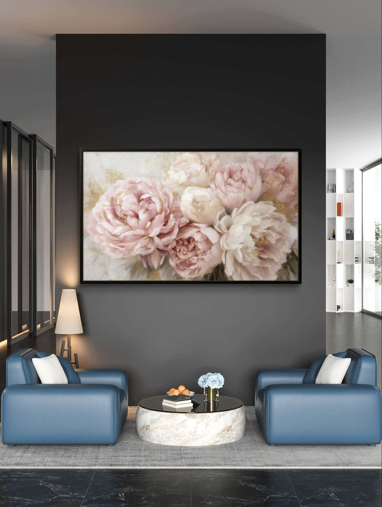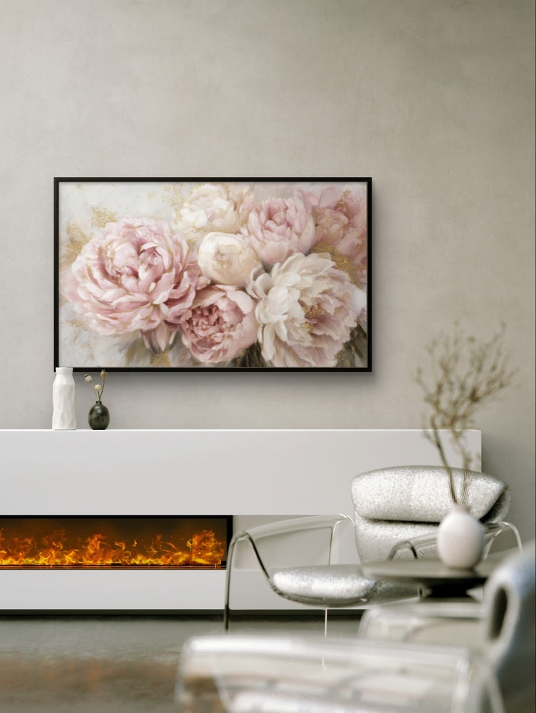 Timeless Peony fängt die zeitlose Schönheit zartrosa Blüten in voller Blüte ein, deren zarte Blütenblätter mit dezenten goldenen Akzenten überzogen sind. Diese raffinierte Komposition strahlt Anmut, Romantik und Eleganz aus und verleiht jedem anspruchsvollen Wohnraum einen Hauch von zeitlosem Charme.