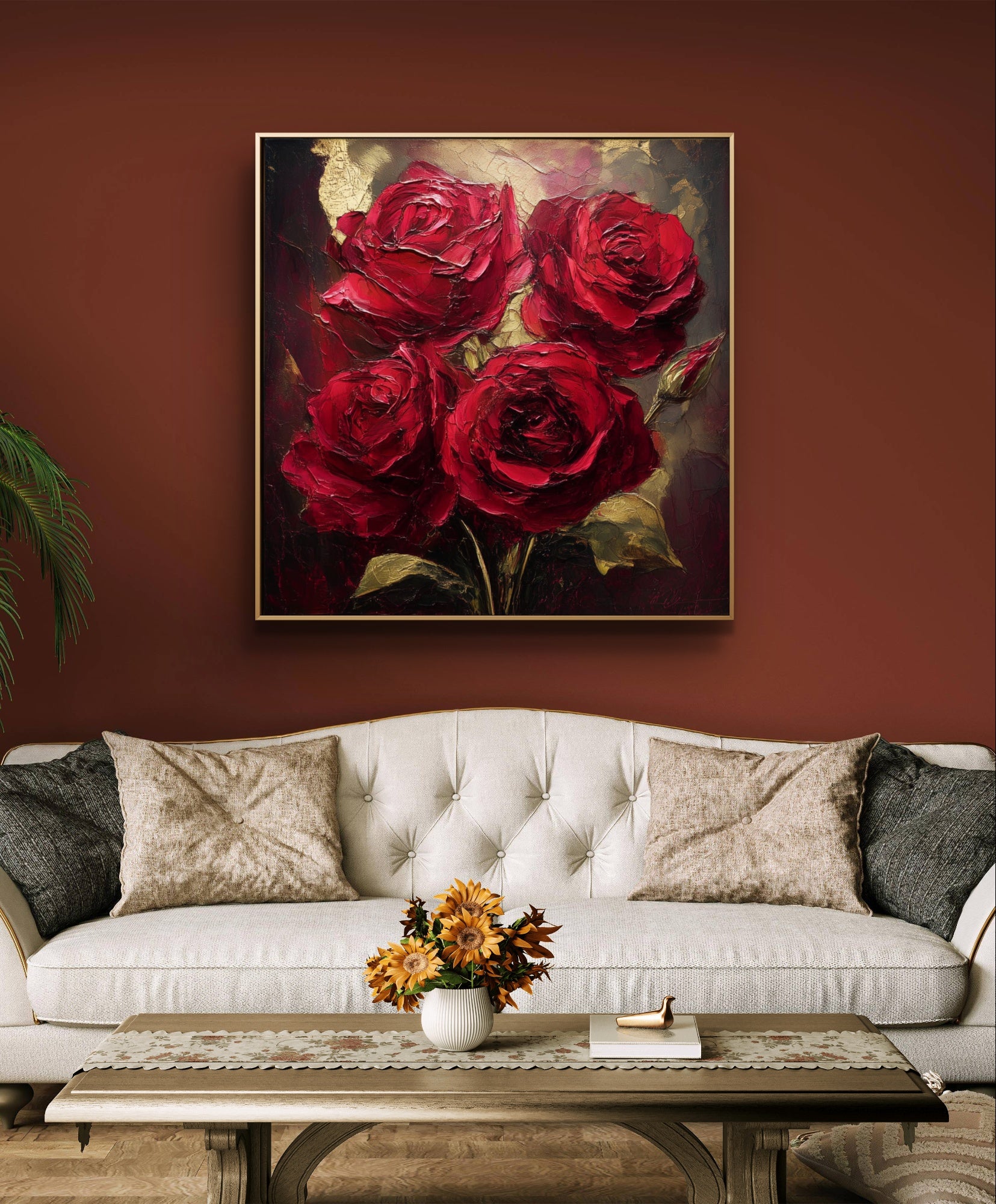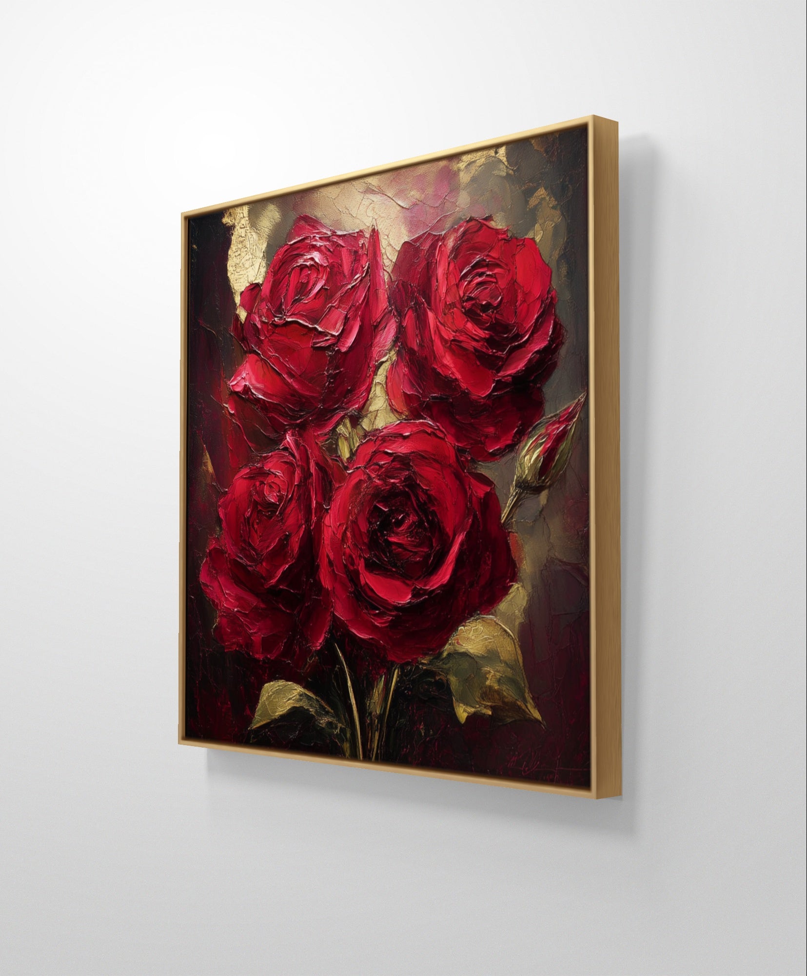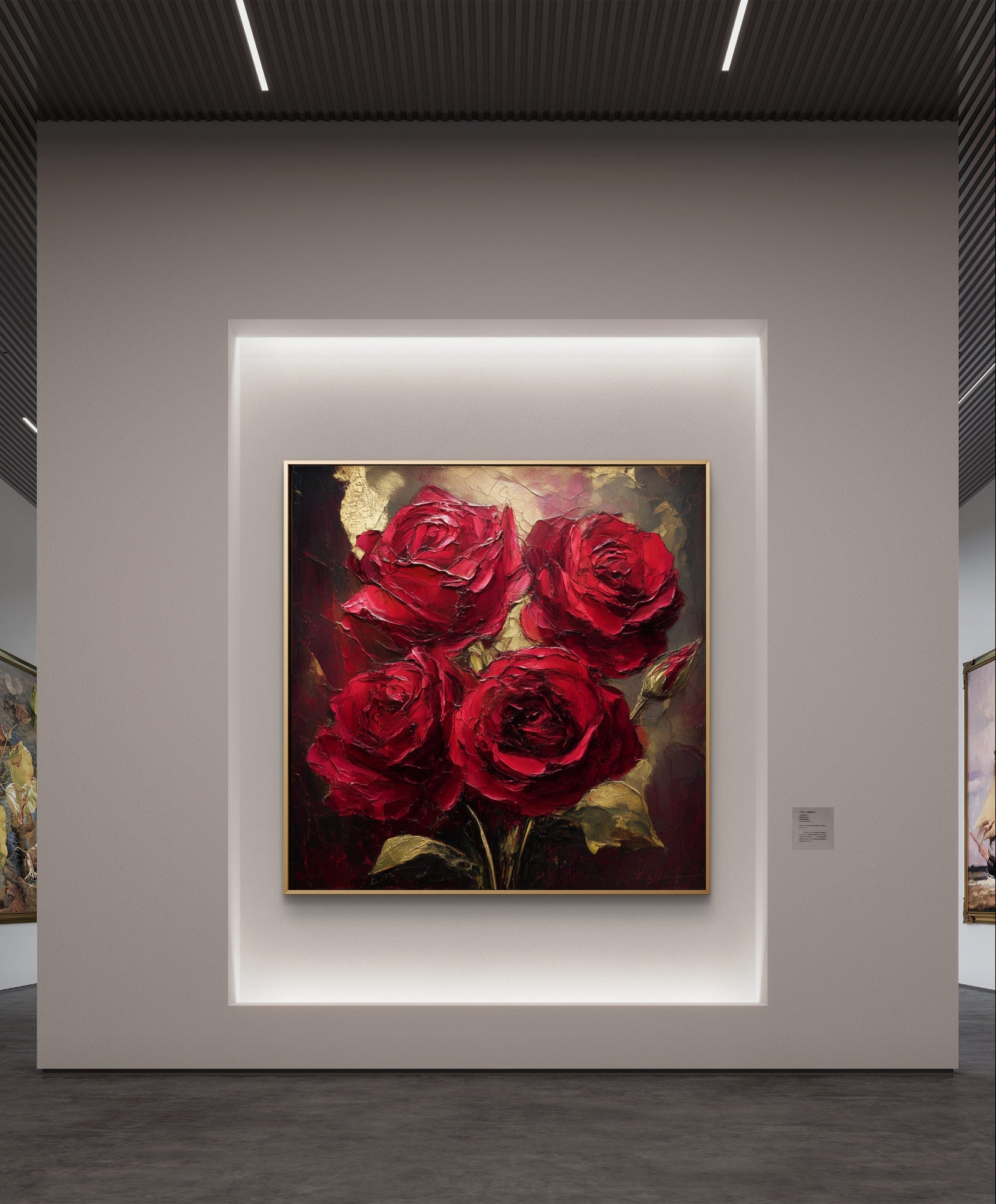 Velvet Passion fängt den zeitlosen Reiz tiefroter Rosen ein, deren üppige Blütenblätter sich vor einem Hintergrund aus Gold und Schatten entfalten. Reich an Textur und Eleganz strahlt dieses Stück Romantik, Luxus und Raffinesse aus – ein exquisites Statement für Innenräume, die Schönheit und Raffinesse zelebrieren.