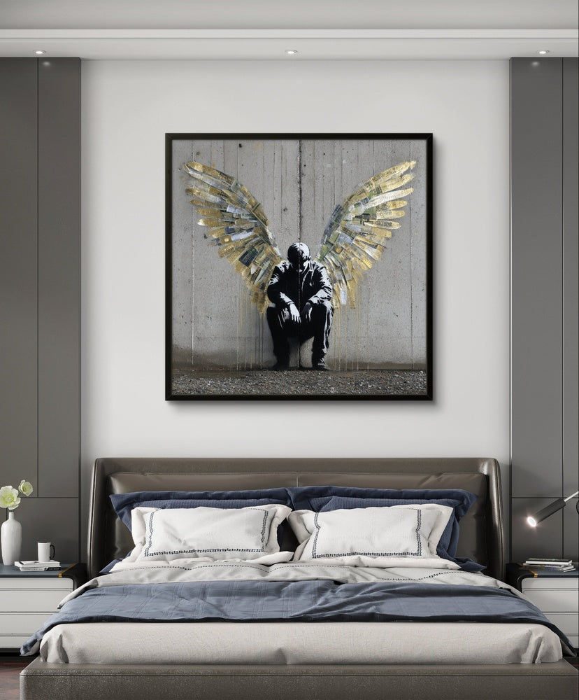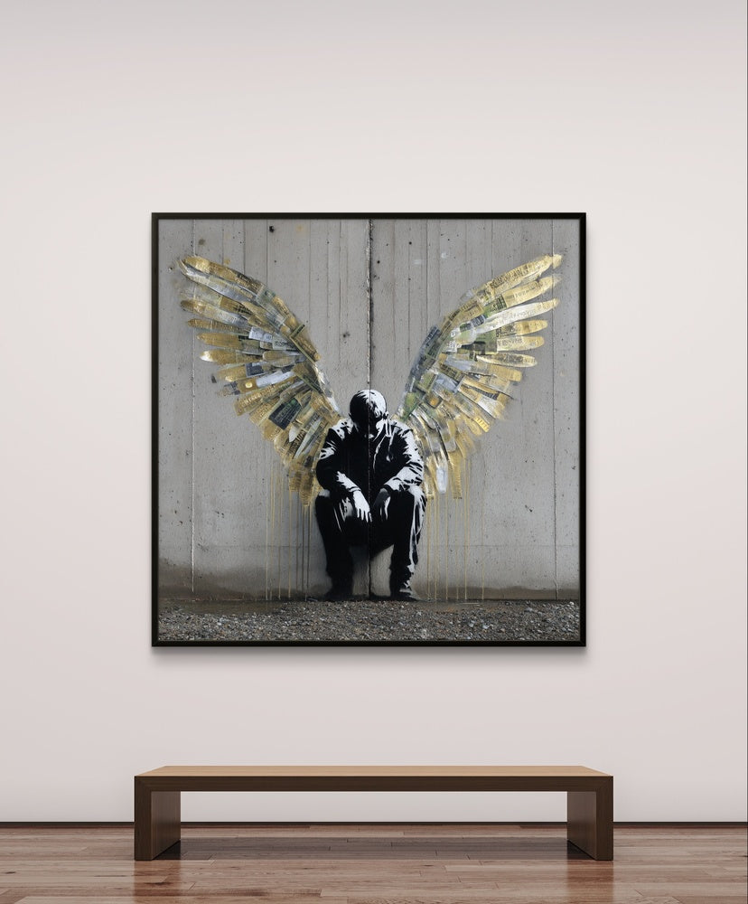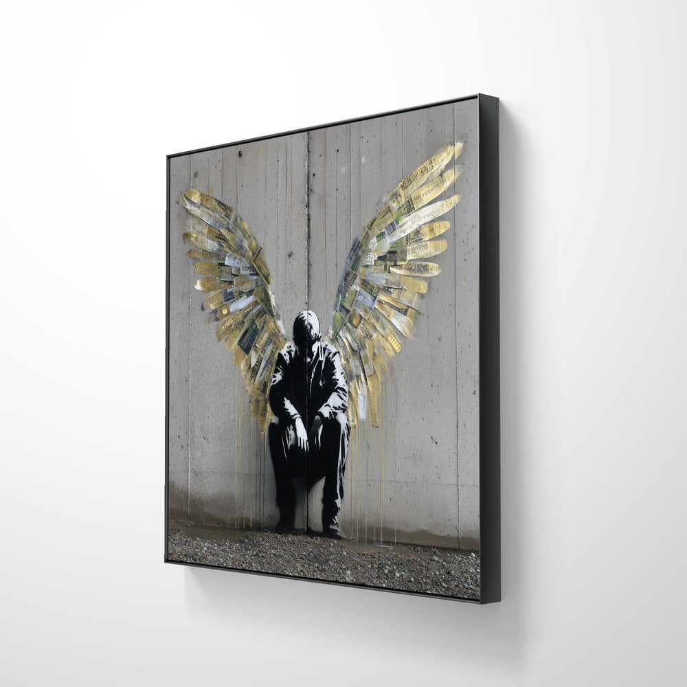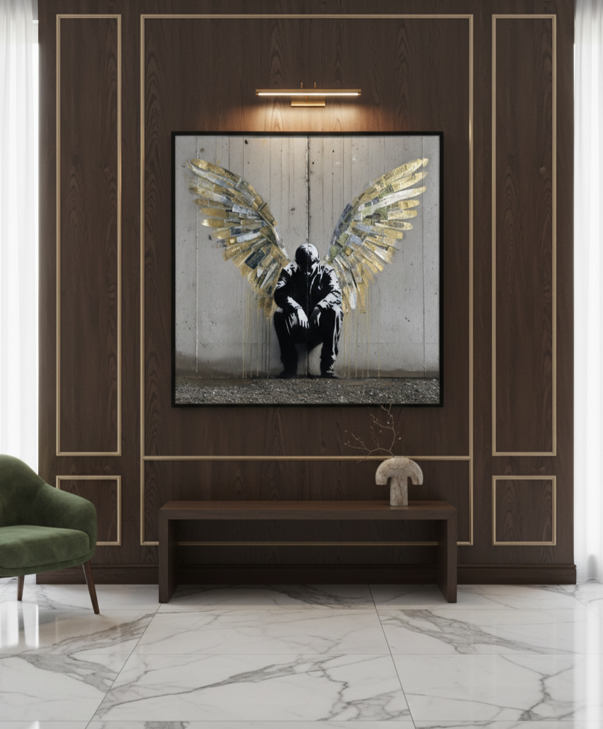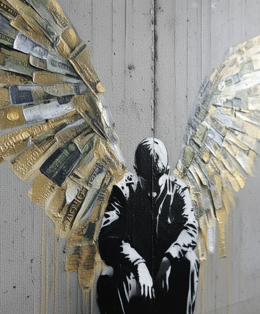 Eine eindrucksvolle Vision einer vermummten Gestalt, die von goldenen Flügeln beschwert wird, die nicht aus Licht, sondern aus Kredit und Last bestehen. „Wings of Debt“ thematisiert die versteckten Kosten des modernen Lebens, in dem der Traum von Freiheit oft durch finanzielle Belastungen gefesselt ist. Eine Erinnerung daran, dass nicht alle Schätze uns erheben, manche uns am Boden halten.
